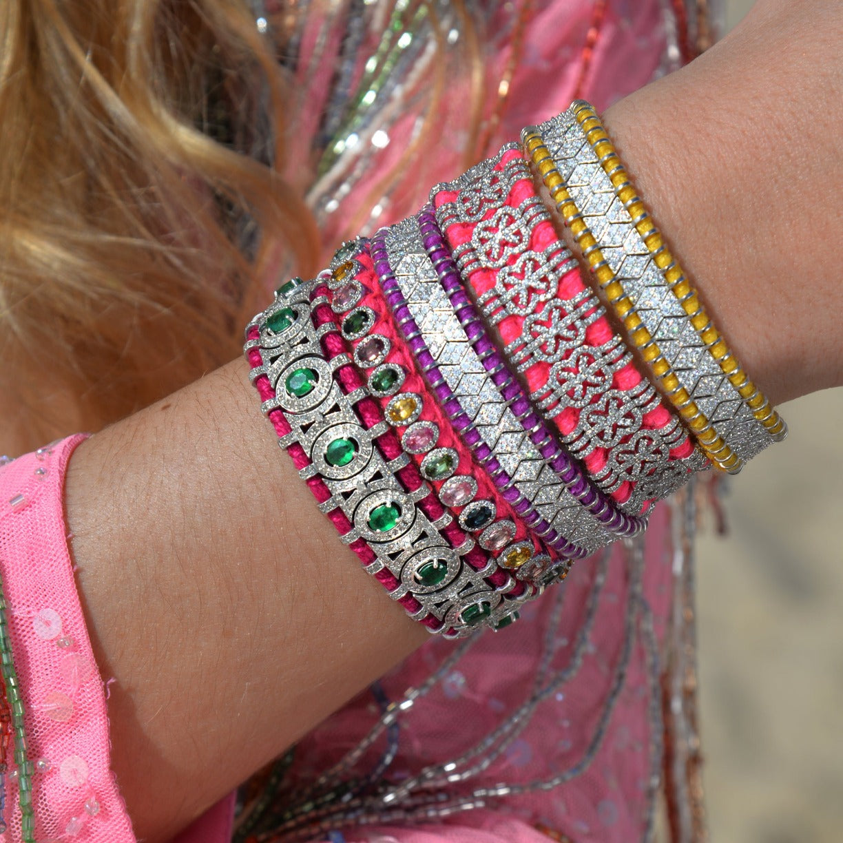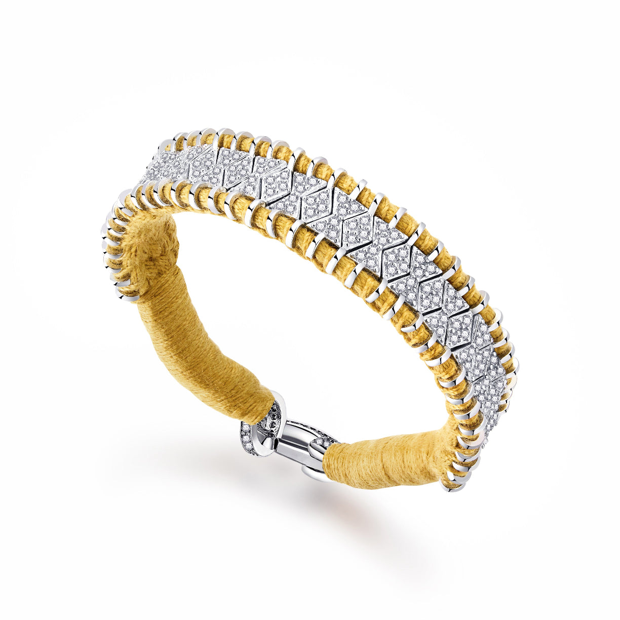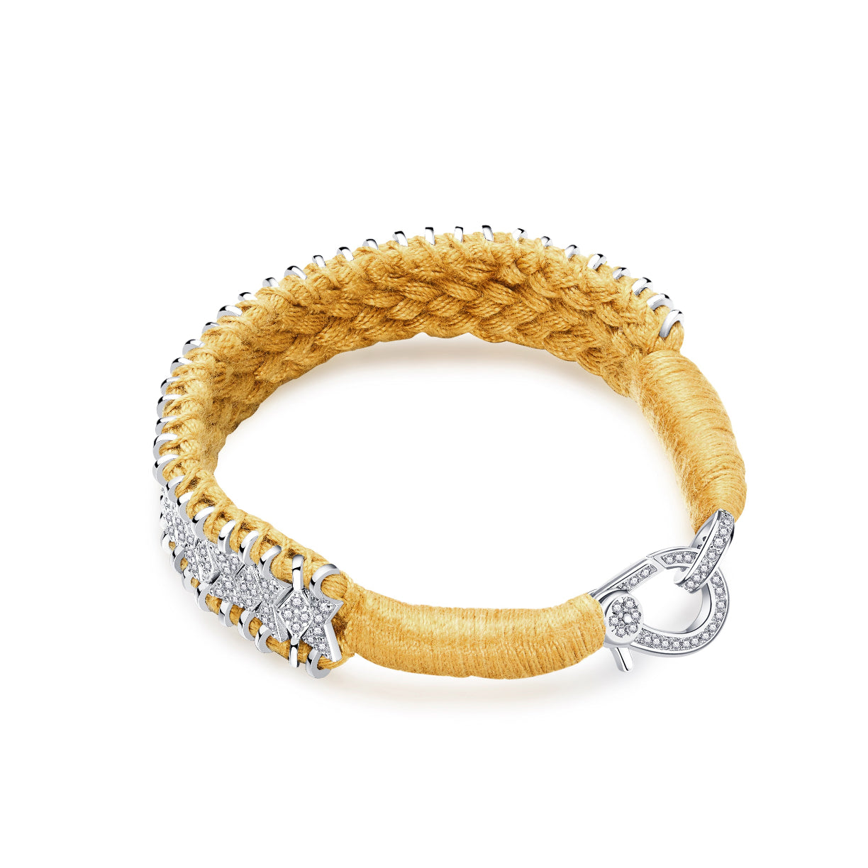 Bracelet en fil de coton tressé de couleur safran décoré d’un motif en argent 925 et serti d’une multitude de diamants.