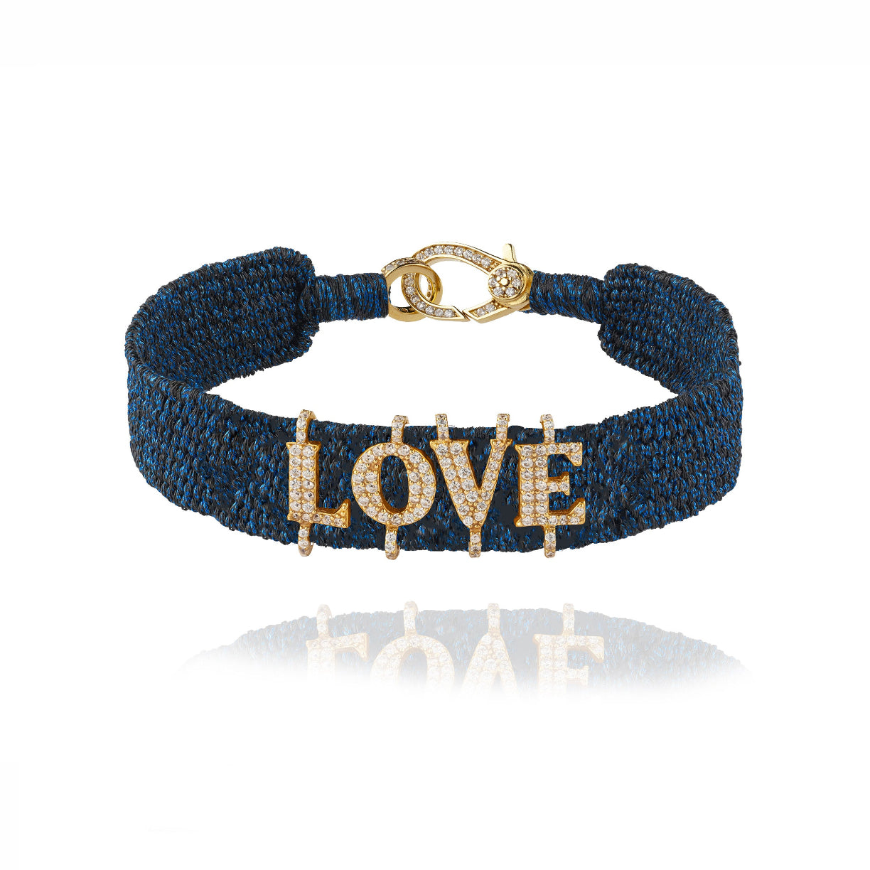 Bracelet en fil de lurex tressé de couleur Abyss, orné de lettres en vermeil serties d’une multitude de moissanites.