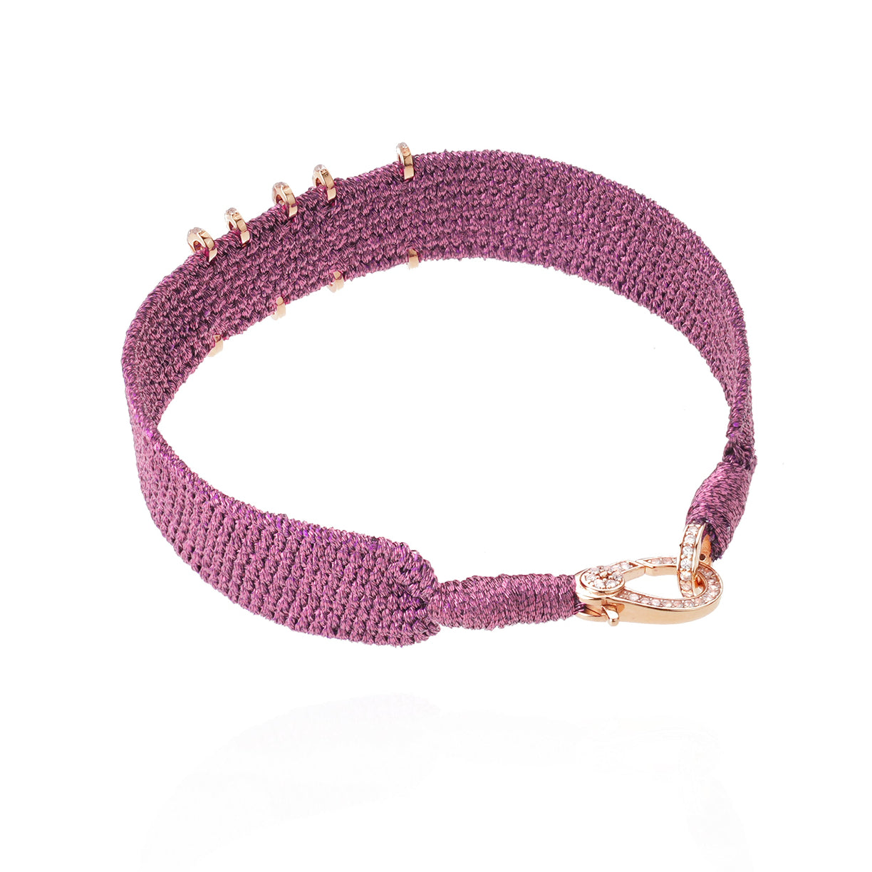 Bracelet en fil de lurex tressé de couleur Candy, orné de lettres en vermeil serties d’une multitude de moissanites.
