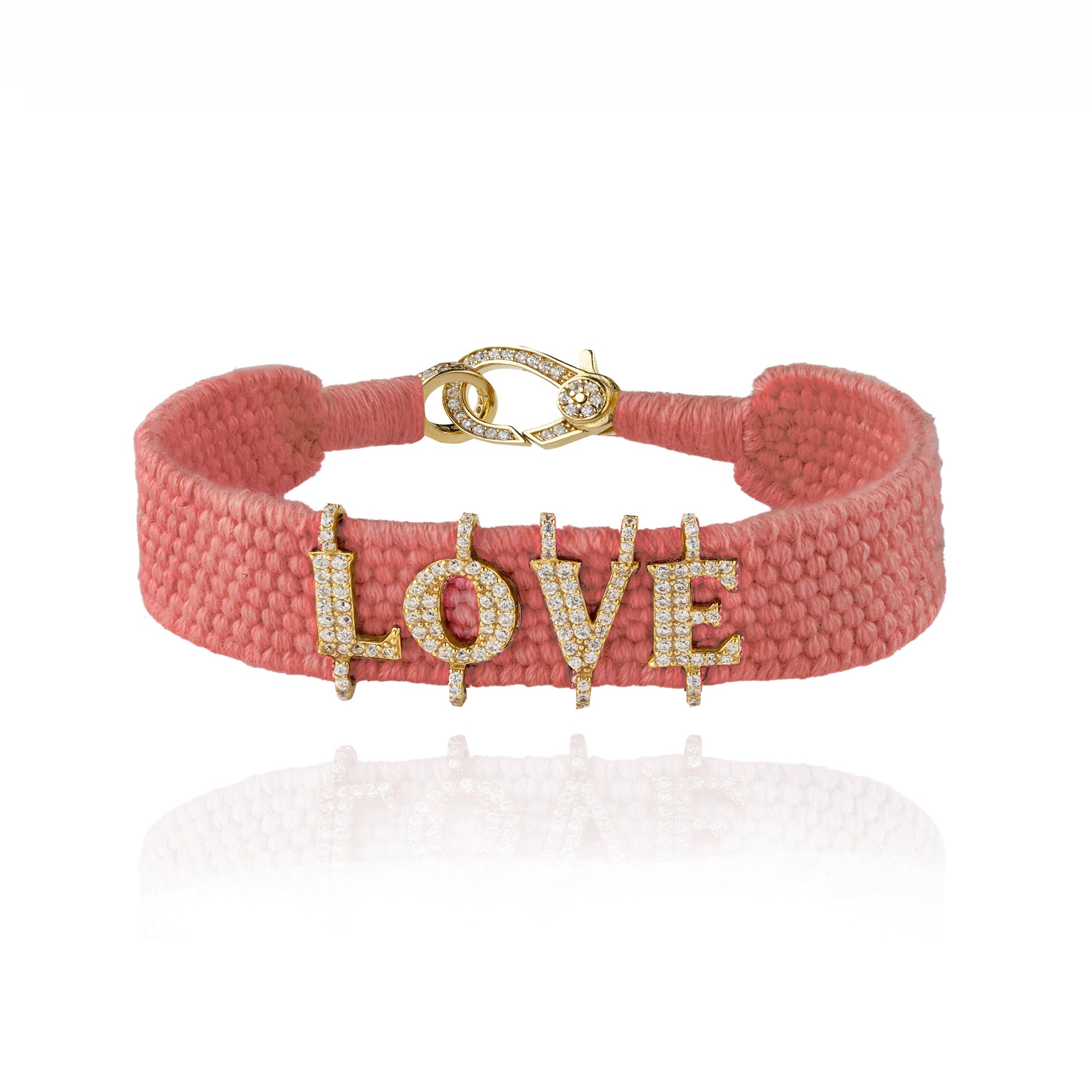 Bracelet en fil de coton tressé de couleur cheeks, orné de lettres en vermeil serties d’une multitude de moissanites.