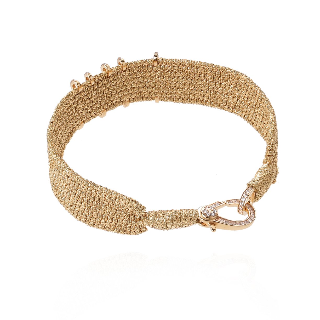 Bracelet en fil de lurex tressé de couleur gold, orné de lettres en vermeil serties d’une multitude de moissanites.