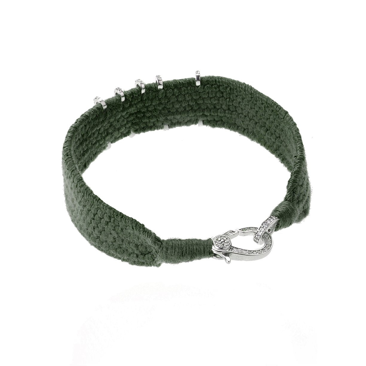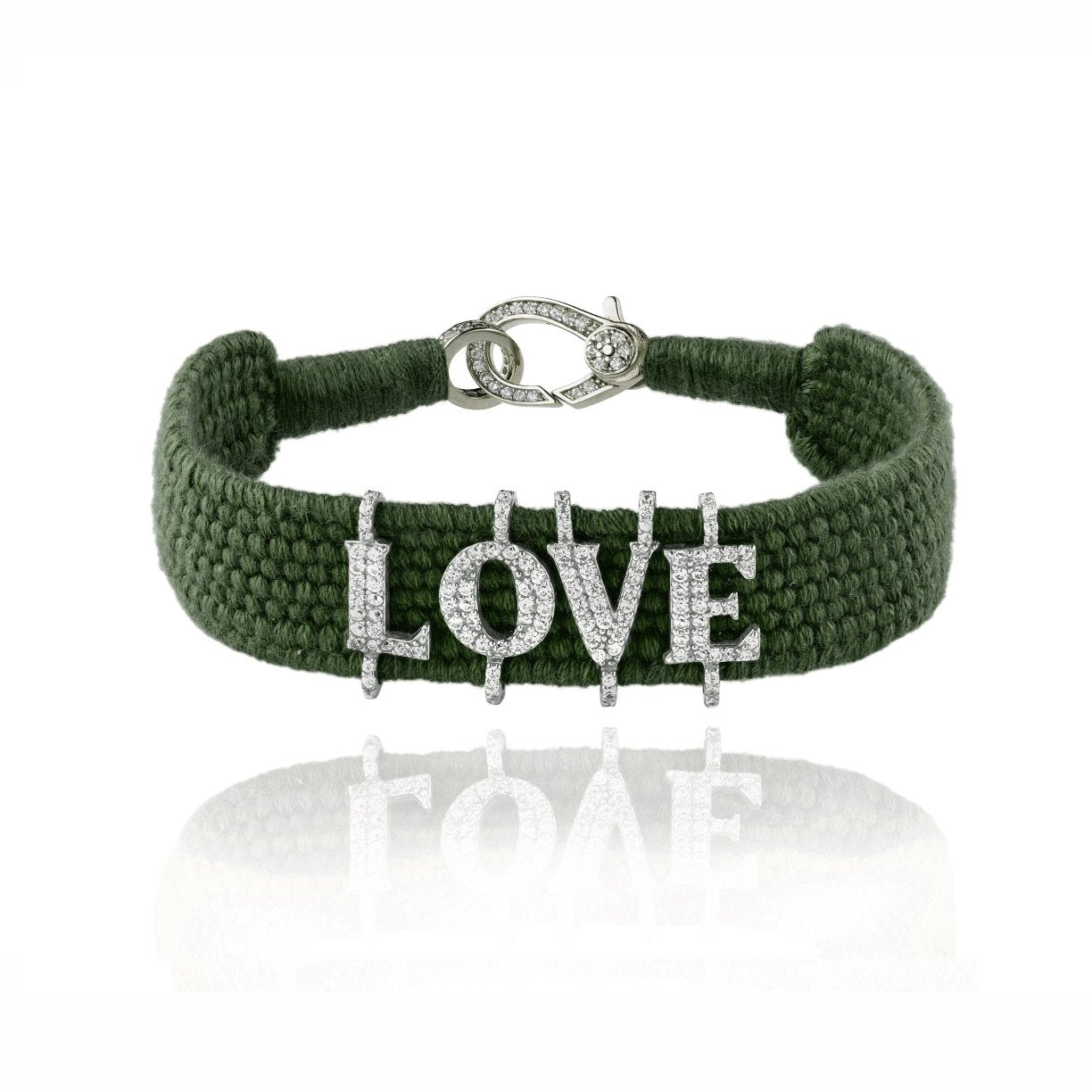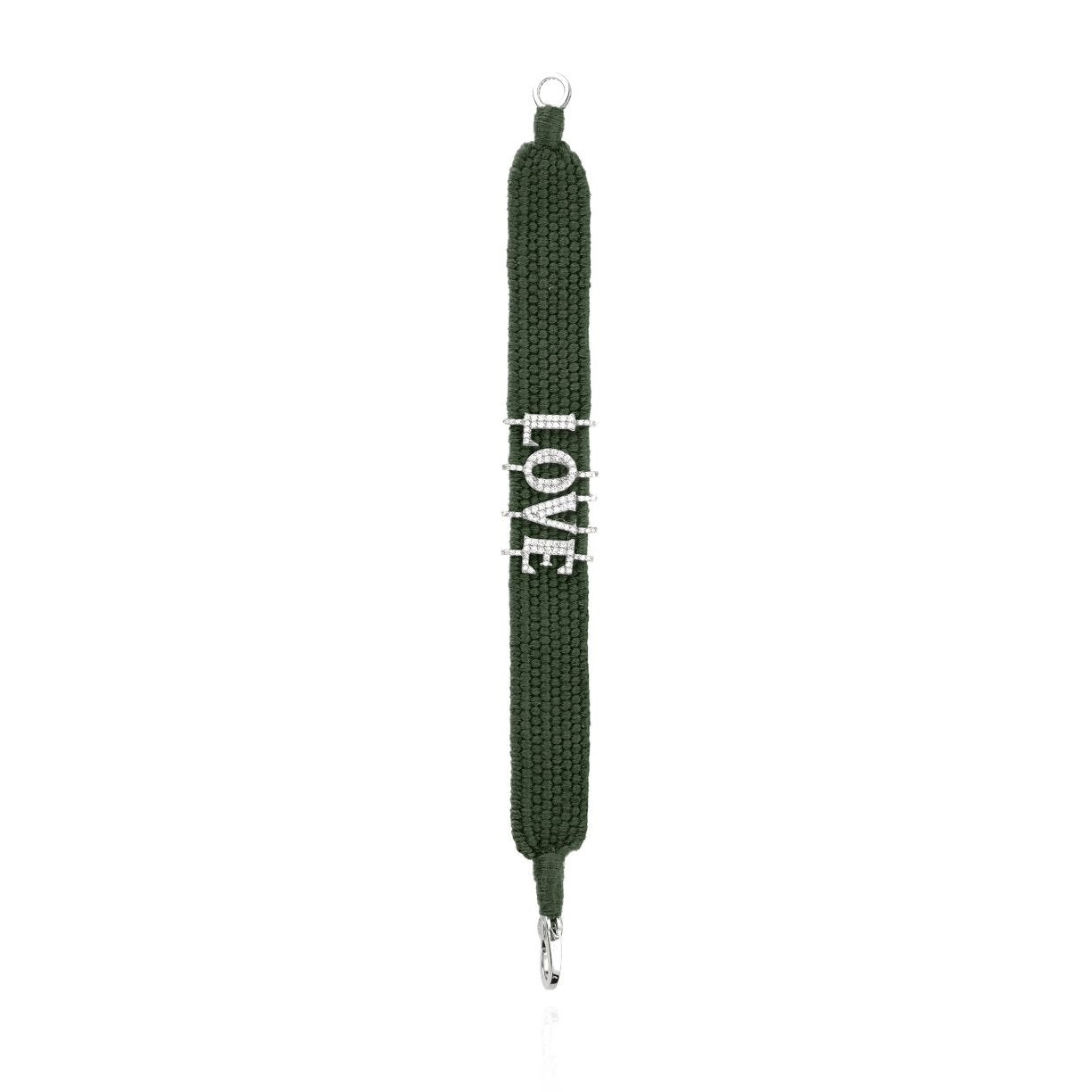 Bracelet en fil de coton tressé de couleur vert kaki, orné de lettres en argent serties d’une multitude de moissanites.