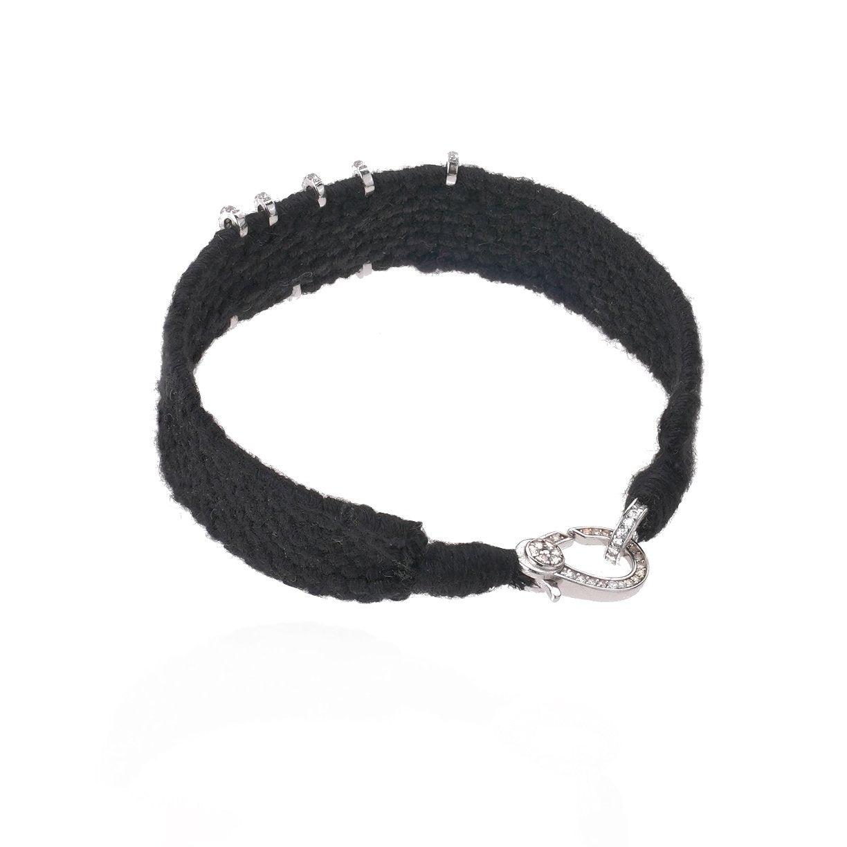 Bracelet en fil de coton tressé de couleur noir, orné de lettres en argent 925 serties d’une multitude de moissanites.