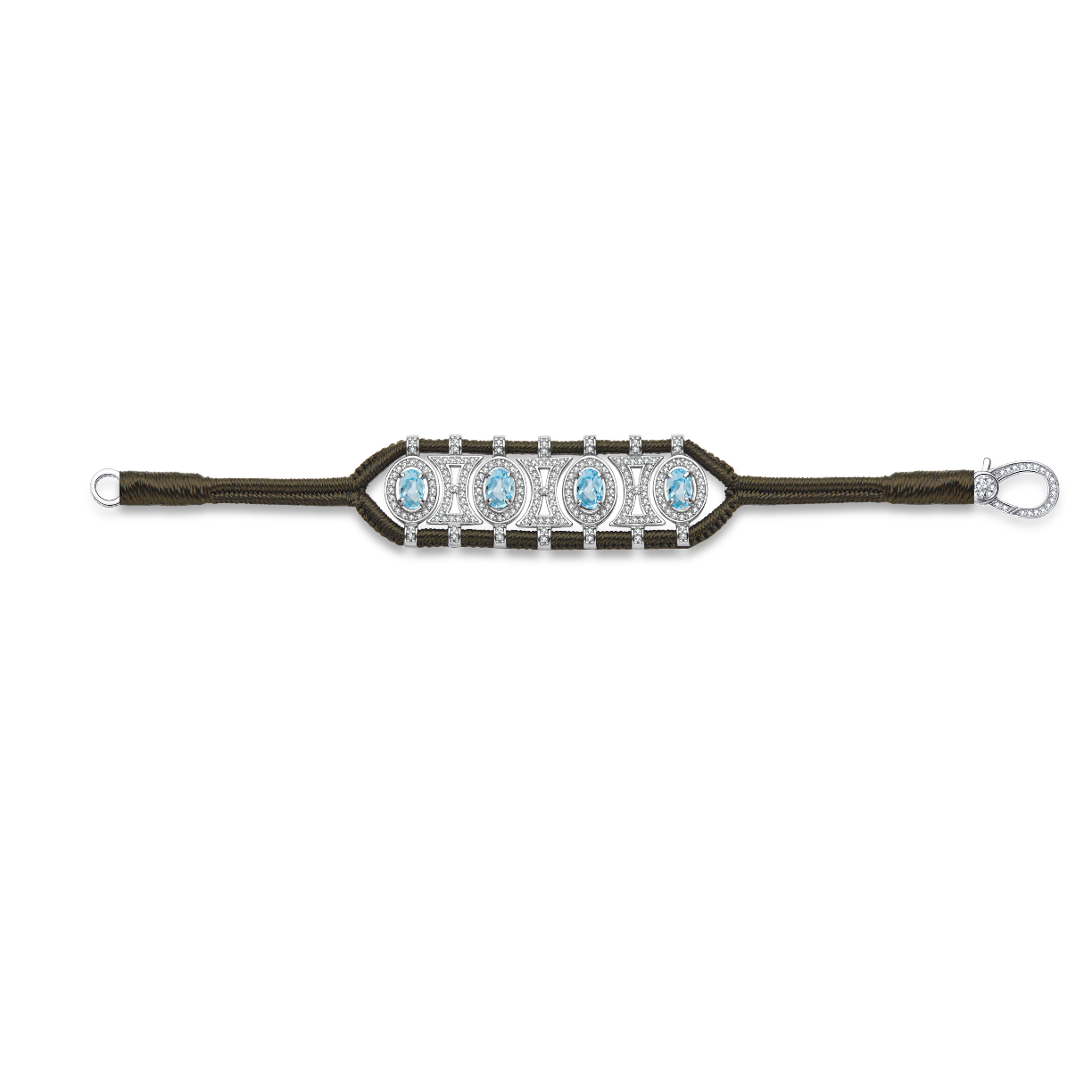 Bracelet ajouré en fil de coton tressé de couleur kaki décoré d'une structure en argent 925 entièrement pavée de moissanites et rehaussée de Topazes bleu swiss ovales.