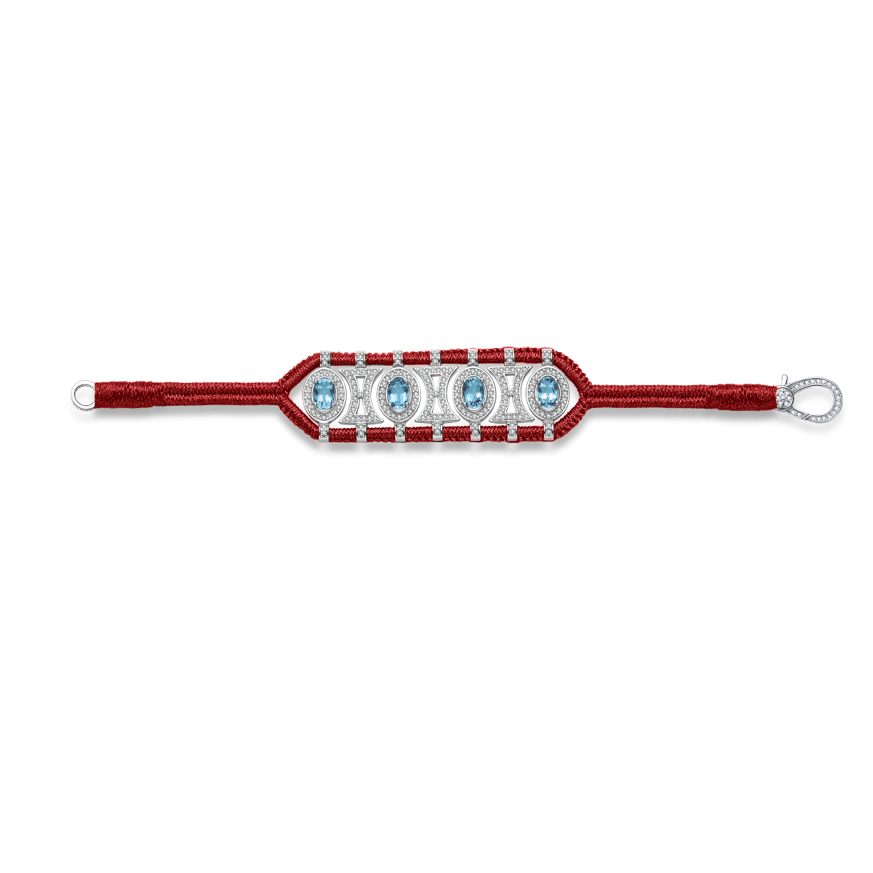 Bracelet ajouré en fil de lurex tressé rouge lipstick décoré d'une structure en argent 925 entièrement pavée de moissanites et rehaussée de Topazes bleu swiss .