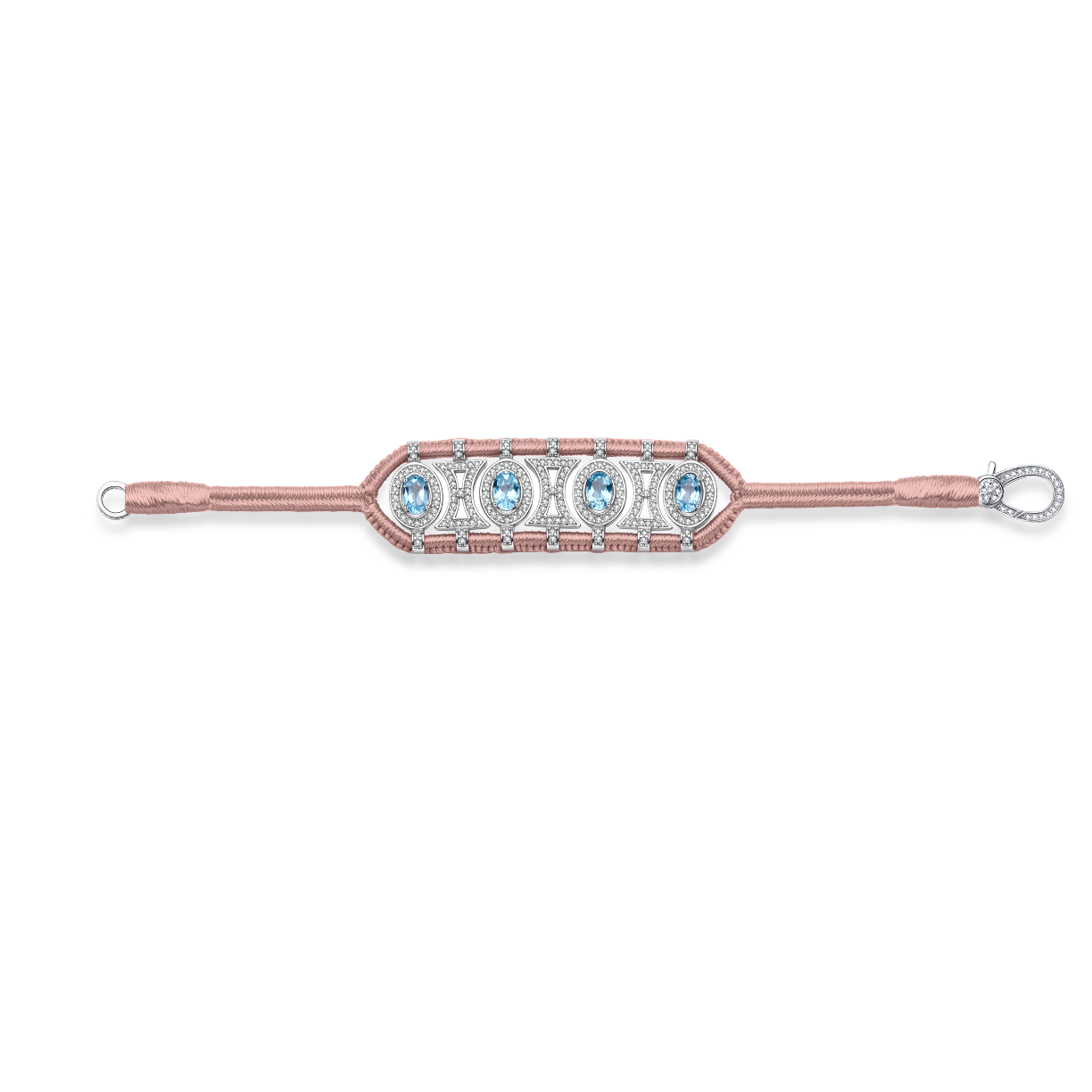 Bracelet ajouré en fil de coton tressé couleur nude décoré d'une structure en argent 925 entièrement pavée de moissanites et rehaussée de Topazes bleu swiss ovales.