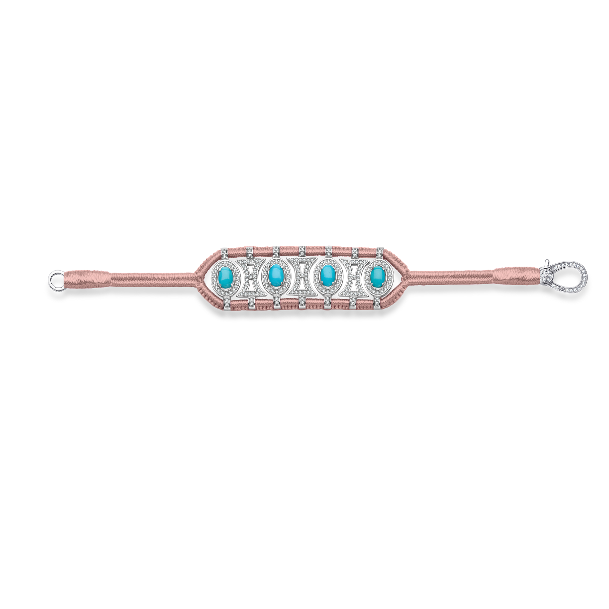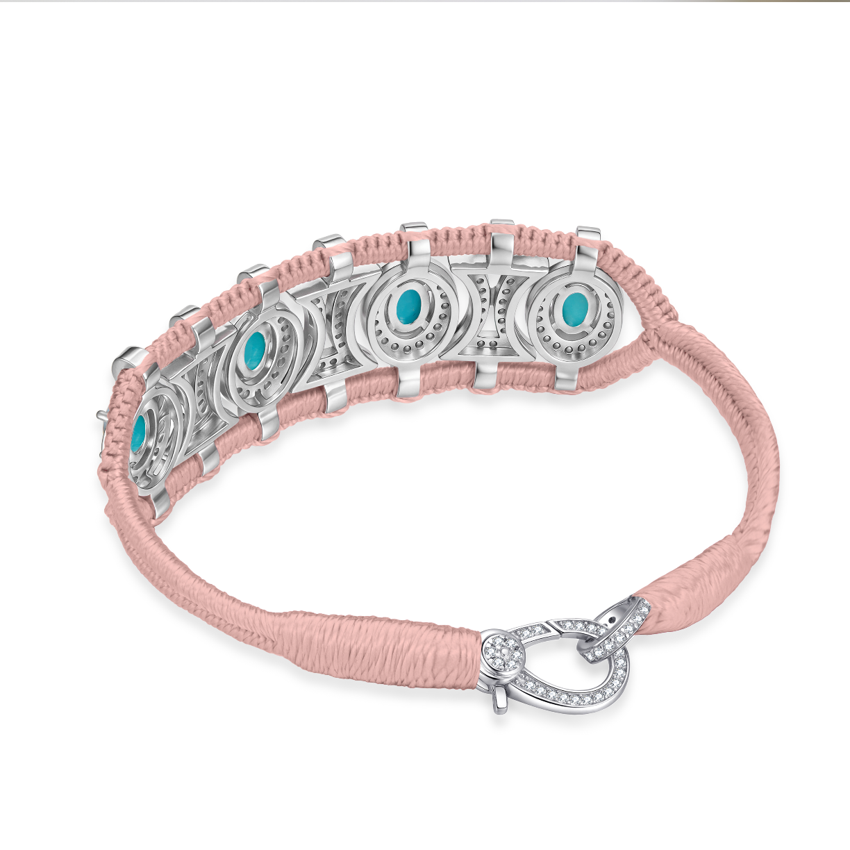 Bracelet ajouré en fil de coton tressé couleur nude décoré d'une structure en argent 925 entièrement pavée de moissanites et rehaussée de turquoises ovales.