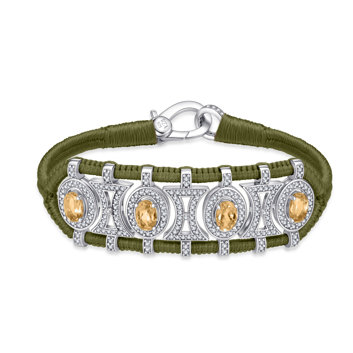 Bracelet ajouré en fil de coton tressé vert olive décoré d'une structure en argent 925 entièrement pavée de moissanites et rehaussée de citrines ovales.