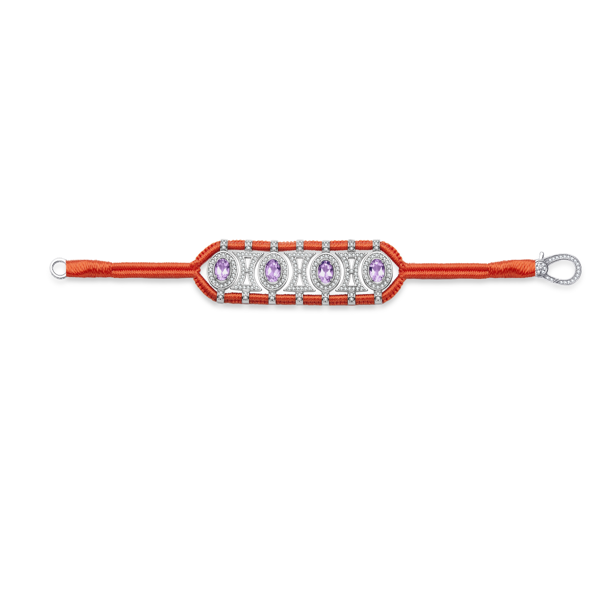 Bracelet ajouré en fil de coton tressé de couleur orange décoré d'une structure en argent 925 entièrement pavée de moissanites et rehaussée d'Améthystes ovales.