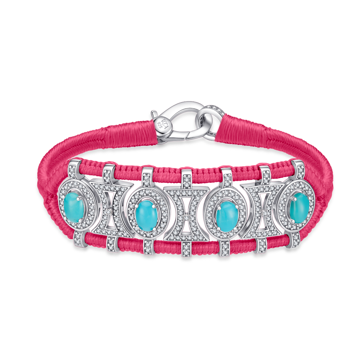 Bracelet ajouré en fil de coton tressé rani décoré d'une structure en argent 925 entièrement pavée de moissanites et rehaussée de turquoises.