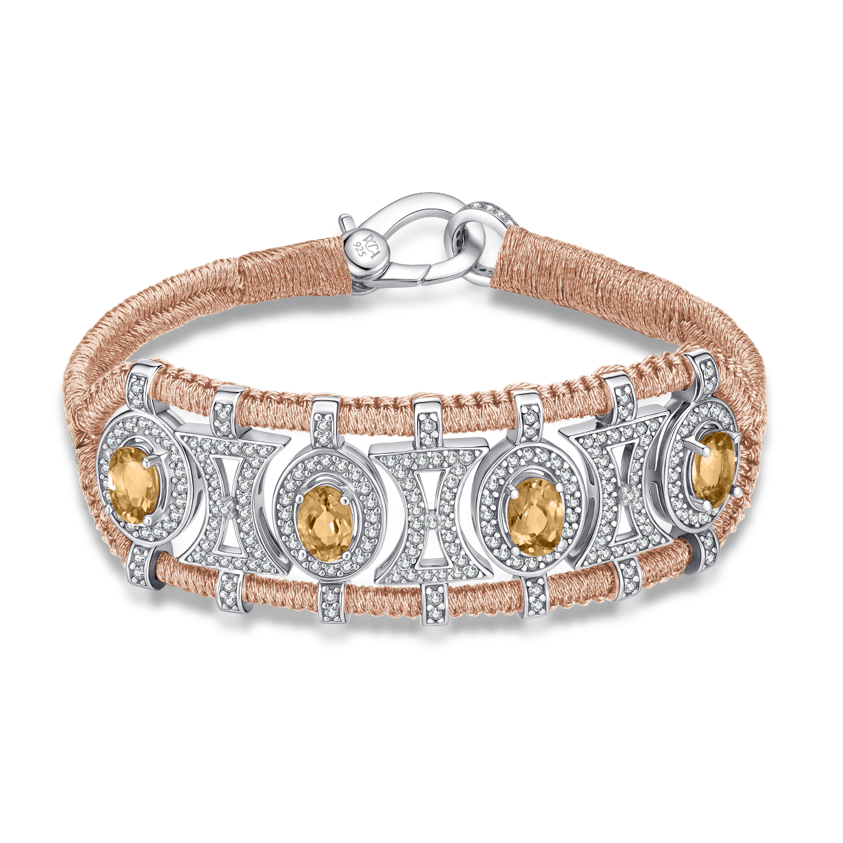 Bracelet ajouré en fil de lurex tressé rose gold décoré d'une structure en argent 925 entièrement pavée de moissanites et rehaussée de Citrines ovales.