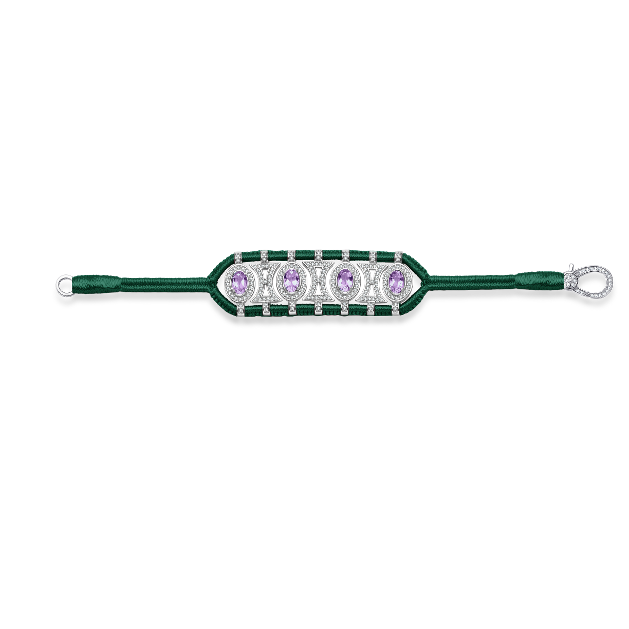 Bracelet ajouré en fil de coton tressé de couleur sapin décoré d'une structure en argent 925 entièrement pavée de moissanites et rehaussée de Améthystes.