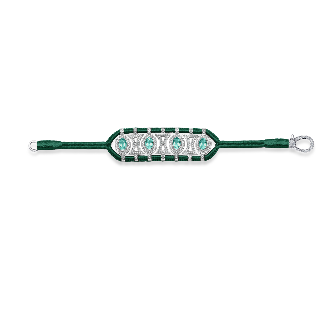 Bracelet ajouré en fil de coton tressé vert sapin décoré d'une structure en argent 925 entièrement pavée de moissanites et rehaussée d'émeraudes ovales.
