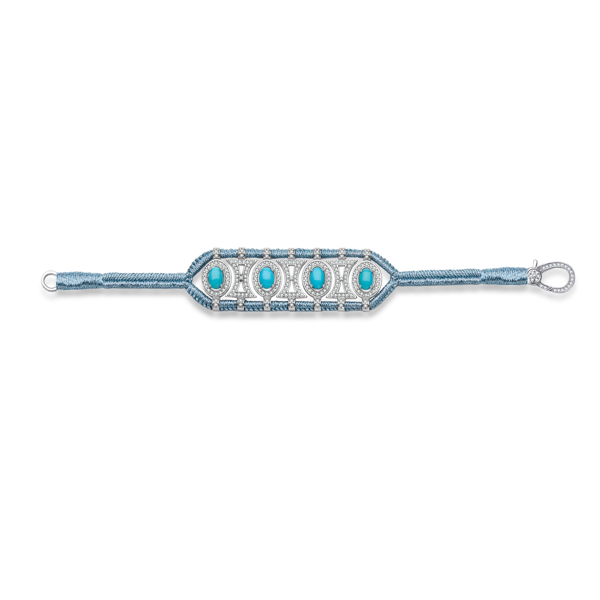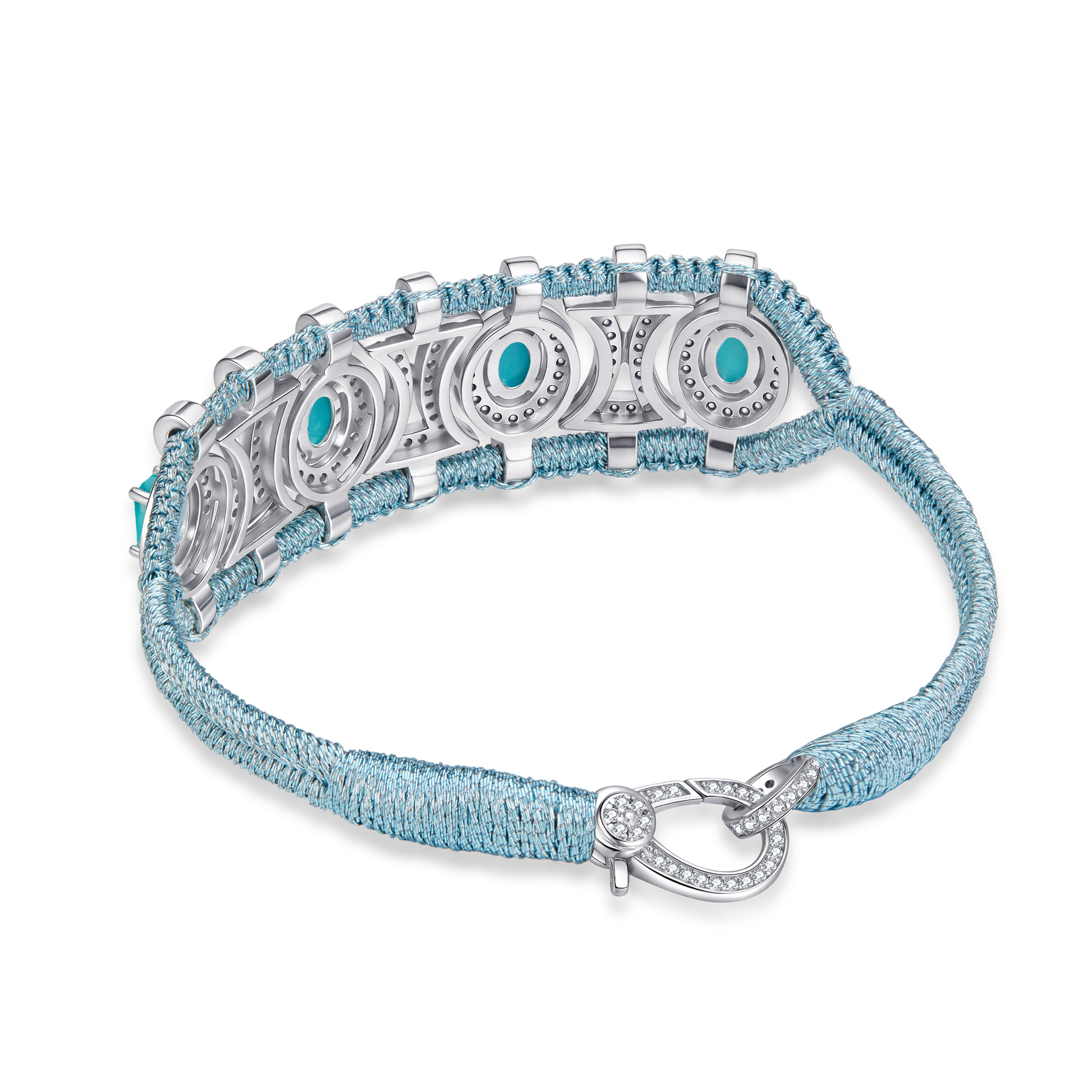 Bracelet ajouré en fil de lurex tressé couleur sky décoré d'une structure en argent 925 entièrement pavée de moissanites et rehaussée de Turquoises ovales.