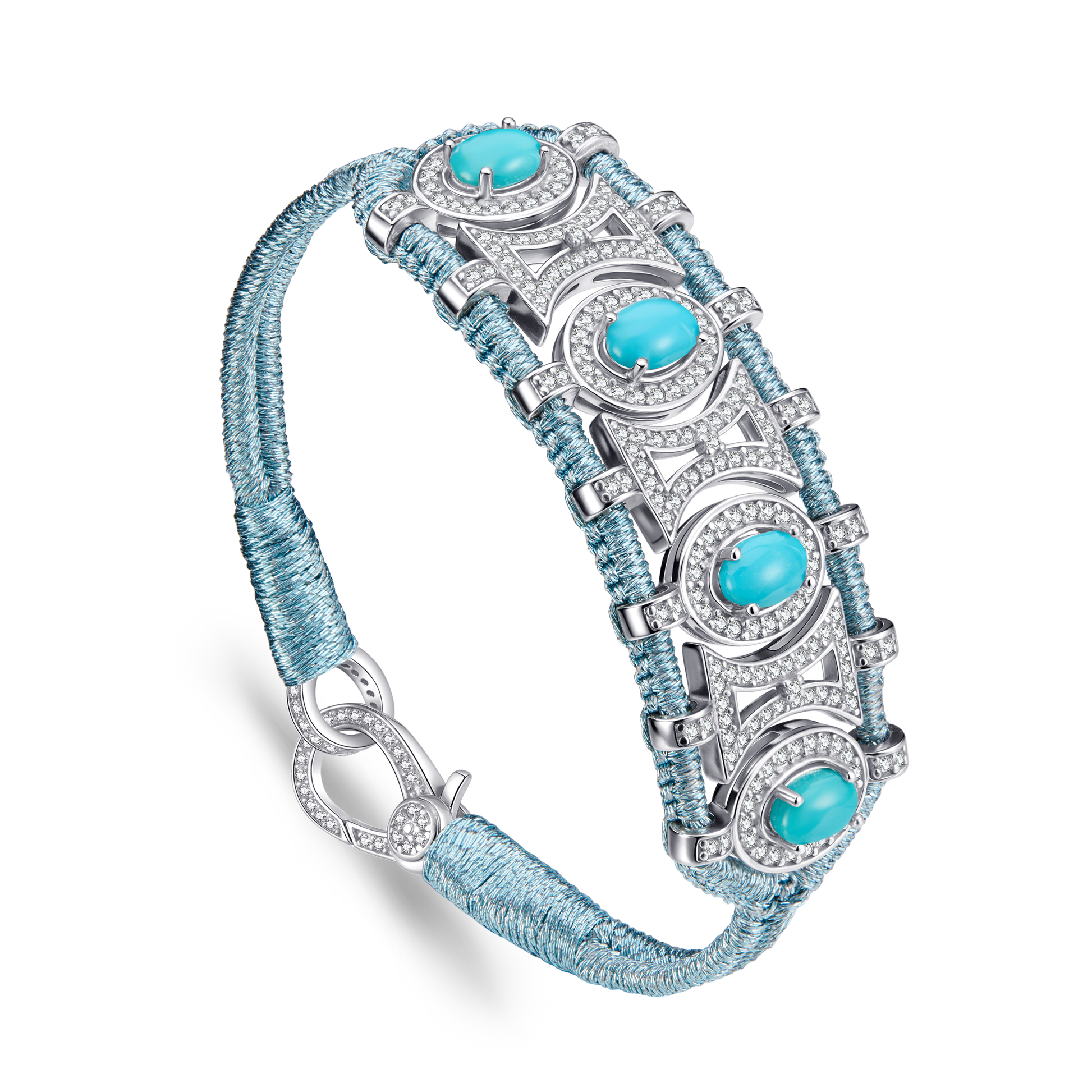 Bracelet ajouré en fil de lurex tressé sky décoré d'une structure en argent 925 entièrement pavée de moissanites et rehaussée de Turquoises.