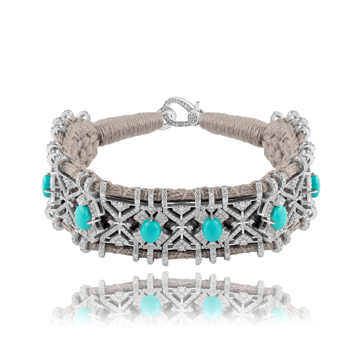 Bracelet en fil de coton tressé de couleur vanilla, décoré d’un motif en argent 925 et serti d’une multitude de diamants. Il est décoré de splendides turquoises véritables.