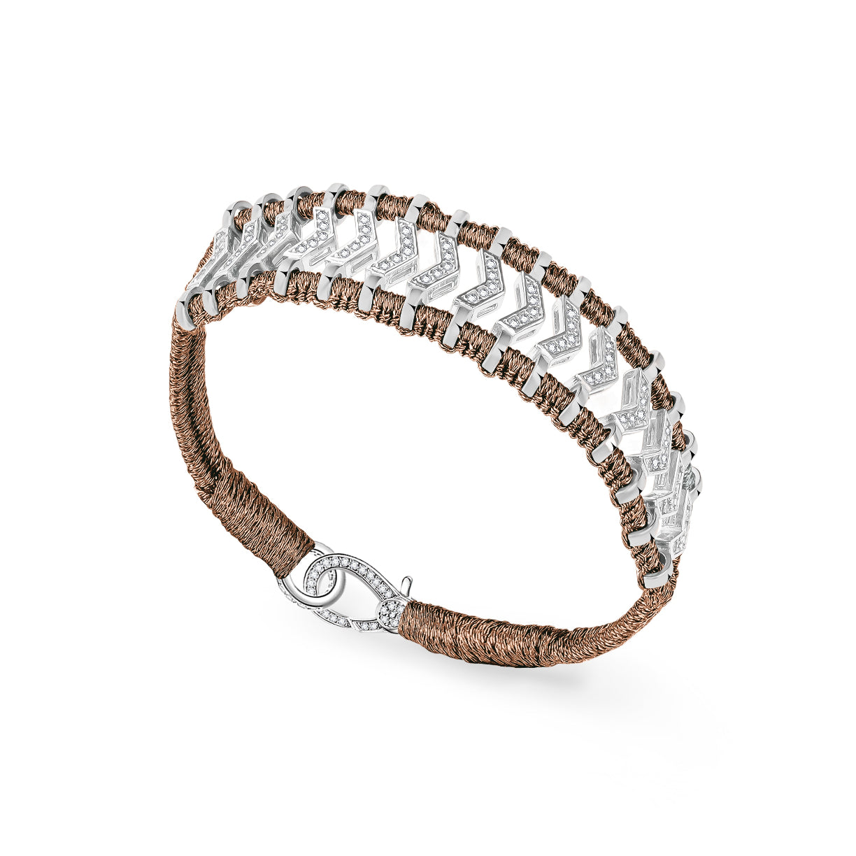 Bracelet fin en fil de lurex tressé de couleur rose gold, décoré d’un motif en argent 925 et serti de moissanites.