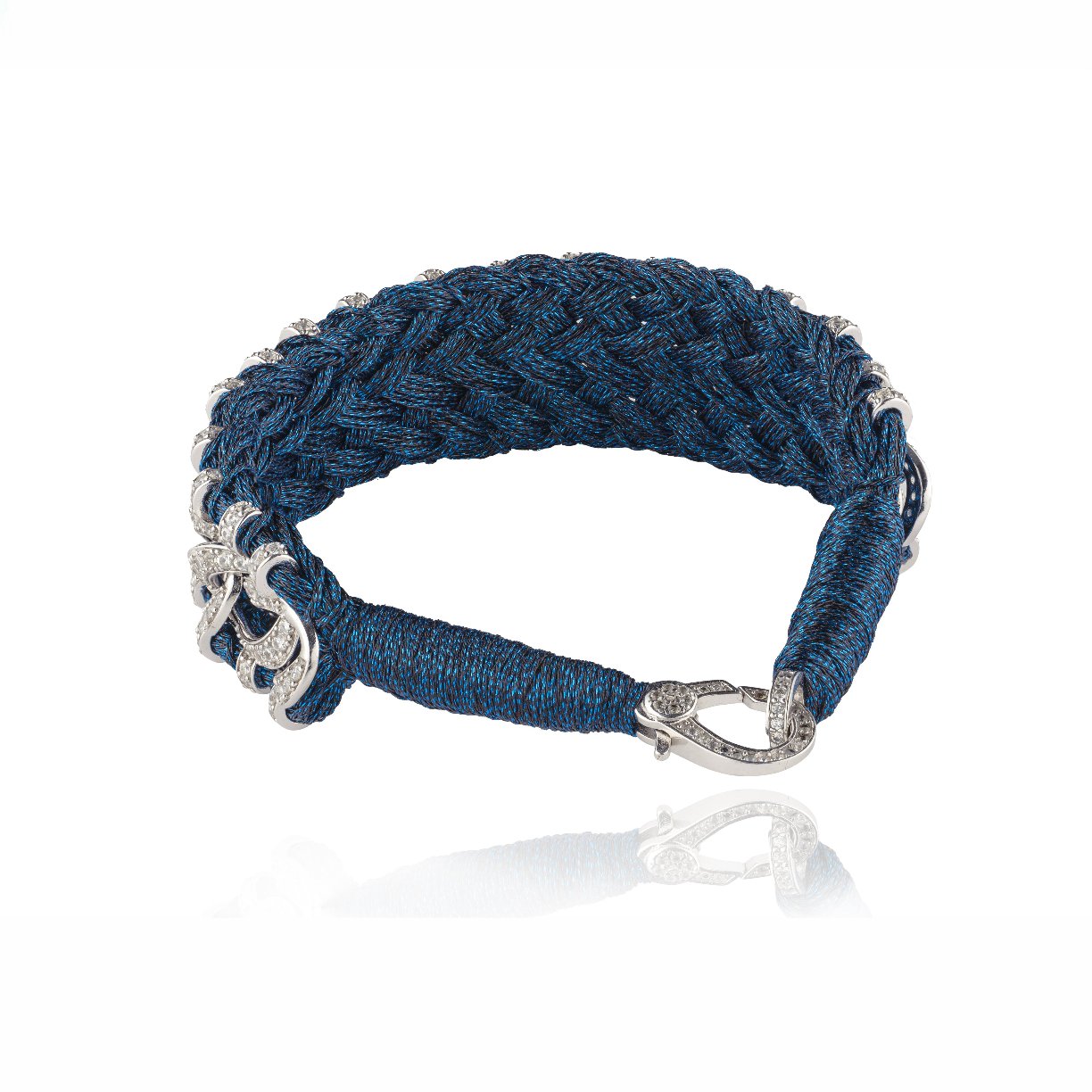 Bracelet en fil de lurex tressé de couleur abyss, décoré d’un motif en argent 925 et serti d’une multitude de diamants.