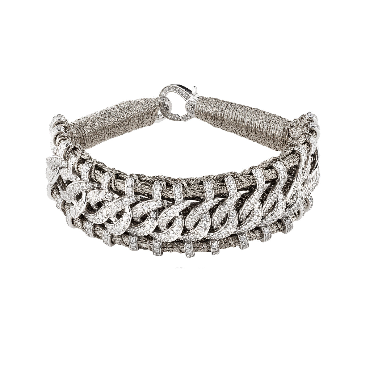 Bracelet en fil de lurex tressé de couleur argent, décoré d’un motif en argent 925 et serti d’une multitude de diamants.