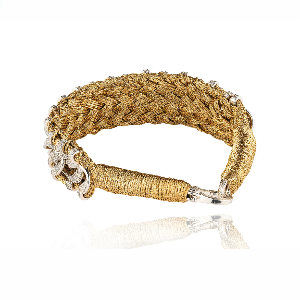 Bracelet en fil de lurex tressé de couleur gold, décoré d’un motif en argent 925 et serti d’une multitude de diamants.