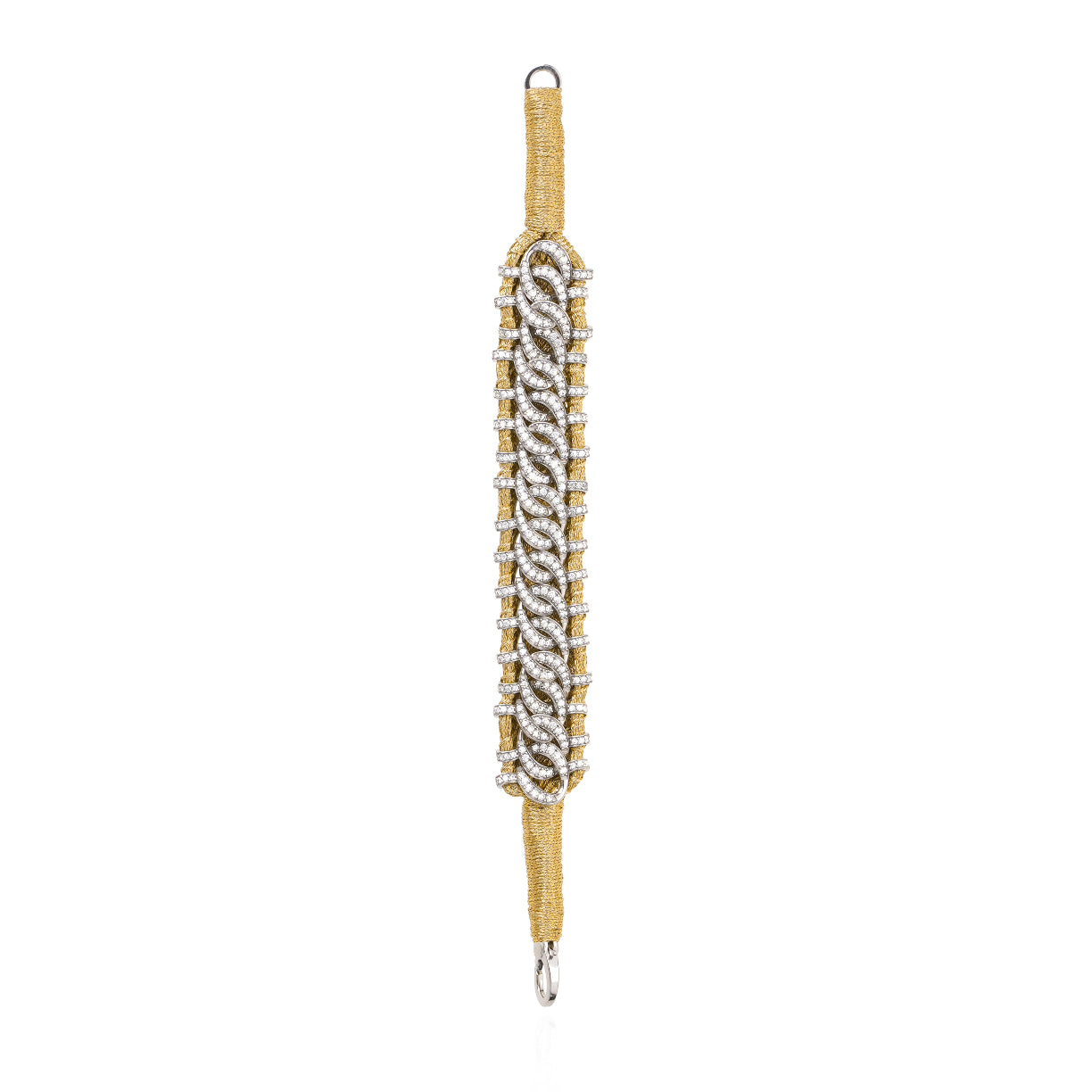 Ce sublime bracelet composé de fil couleur gold et décoré d’un motif argent aux allures de chaîne à maillons imposants. La structure en argent est sertie de plus de 800 diamants.