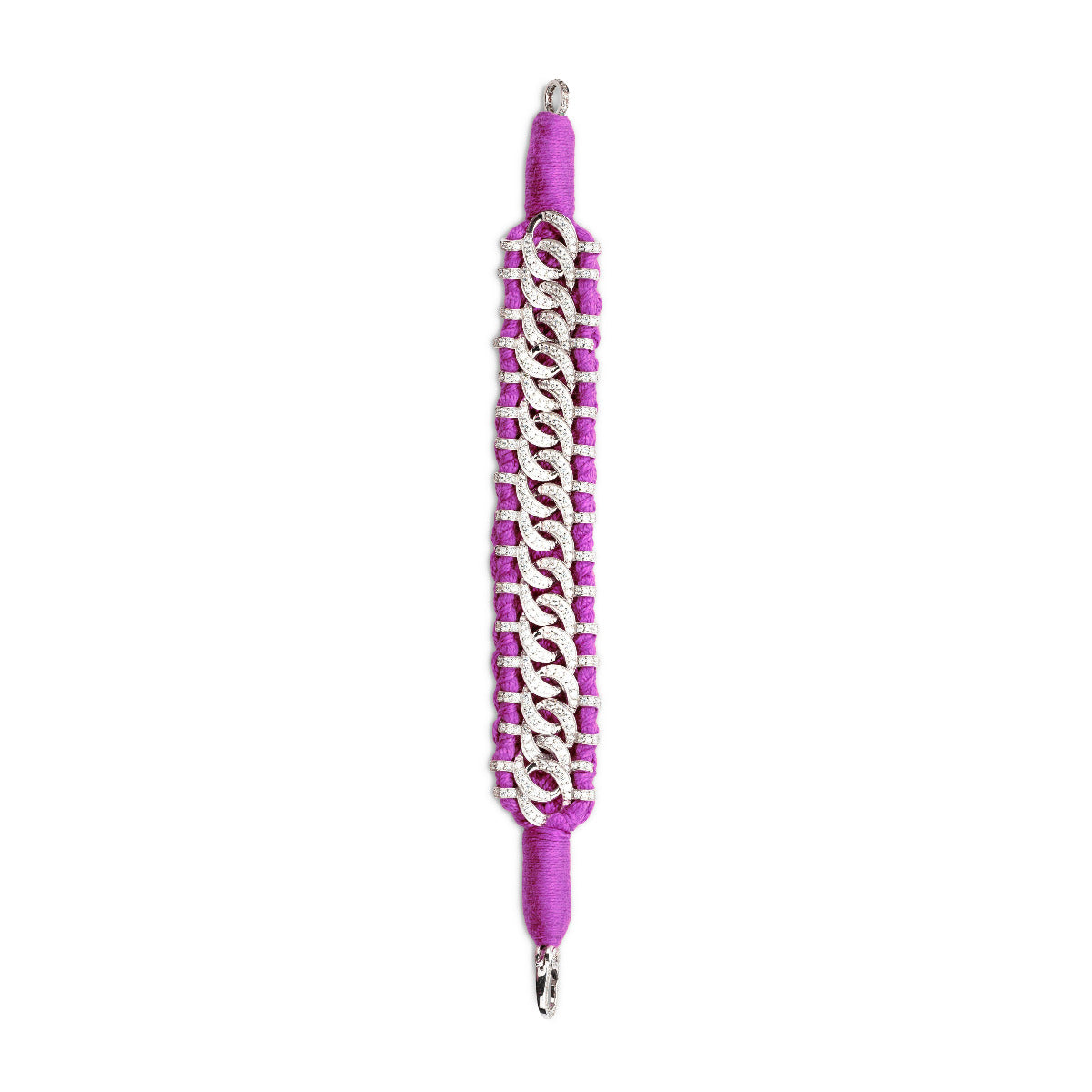 Ce sublime bracelet composé de fil couleur violet et décoré d’un motif argent aux allures de chaîne à maillons imposants. La structure en argent est sertie de plus de 800 diamants.