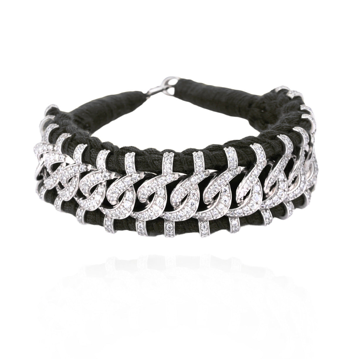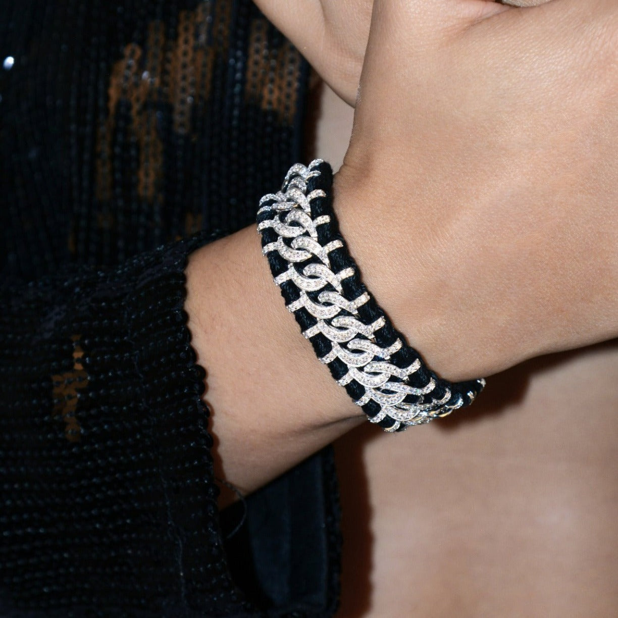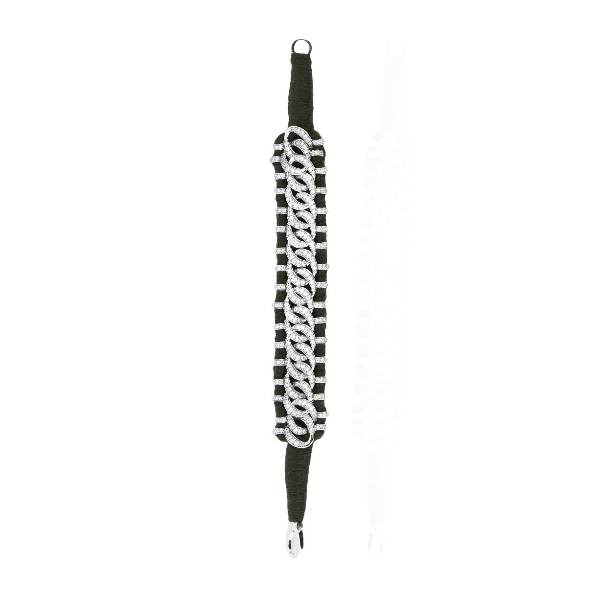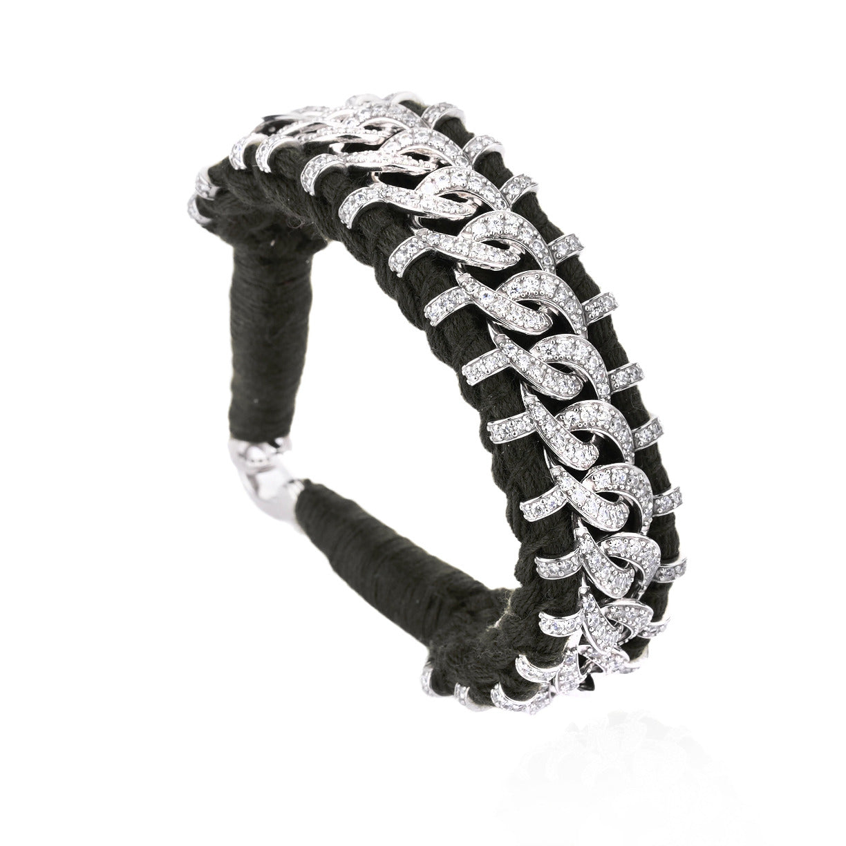 Ce sublime bracelet composé de fil couleur noir et décoré d’un motif argent aux allures de chaîne à maillons imposants. La structure en argent est sertie de plus de 800 diamants.
