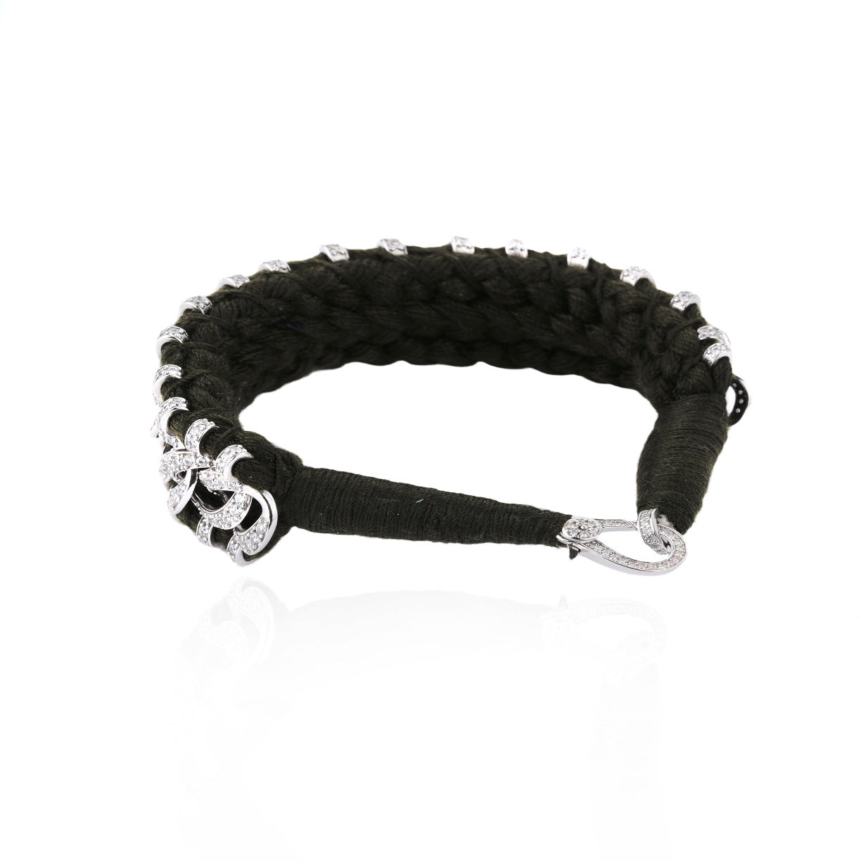 Bracelet en fil de coton tressé de couleur noir, décoré d’un motif en argent 925 et serti d’une multitude de diamants.
