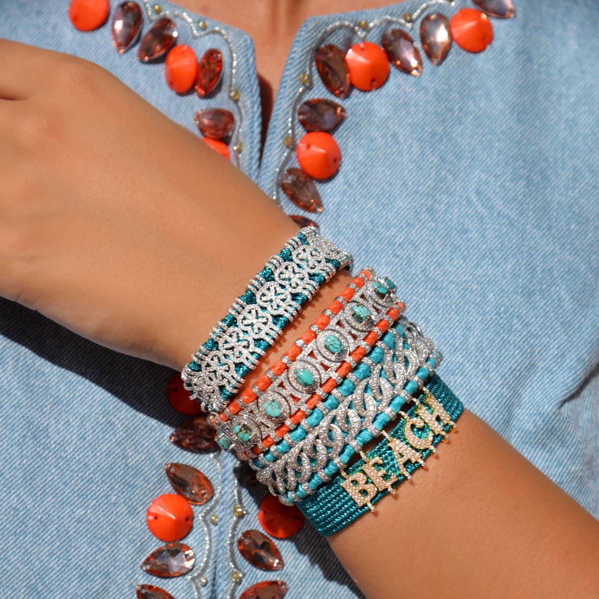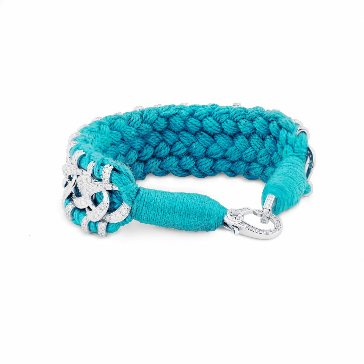 Ce sublime bracelet composé de fil couleur turquoise et décoré d’un motif argent aux allures de chaîne à maillons imposants. La structure en argent est sertie de plus de 800 diamants.