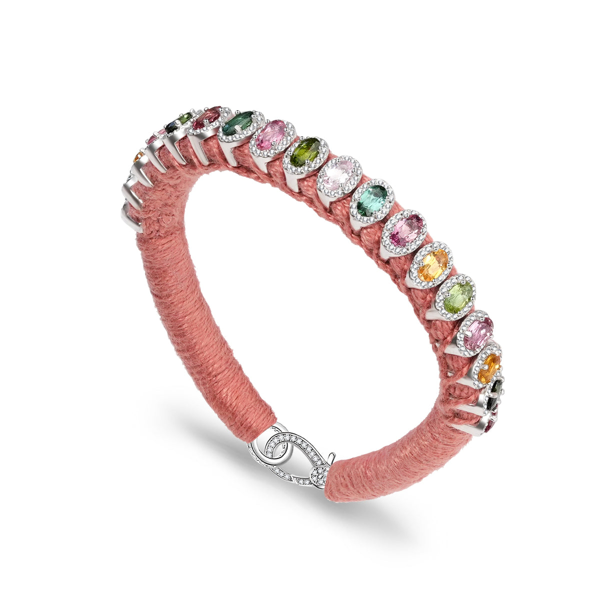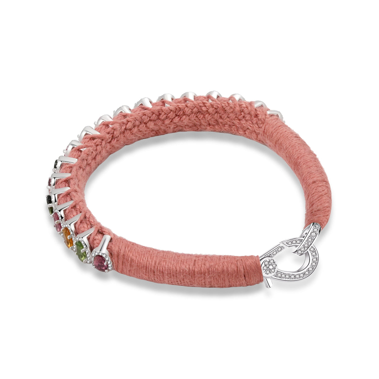 Bracelet fin en fil de coton tressé de couleur blush. Il est orné de multiples petits ovales en argent intégralement sertis de plus de 200 diamants et rehaussés, en leur centre, de Tourmalines multicolores.