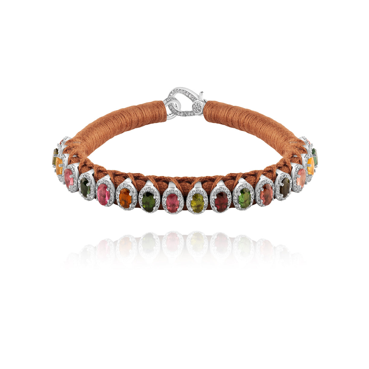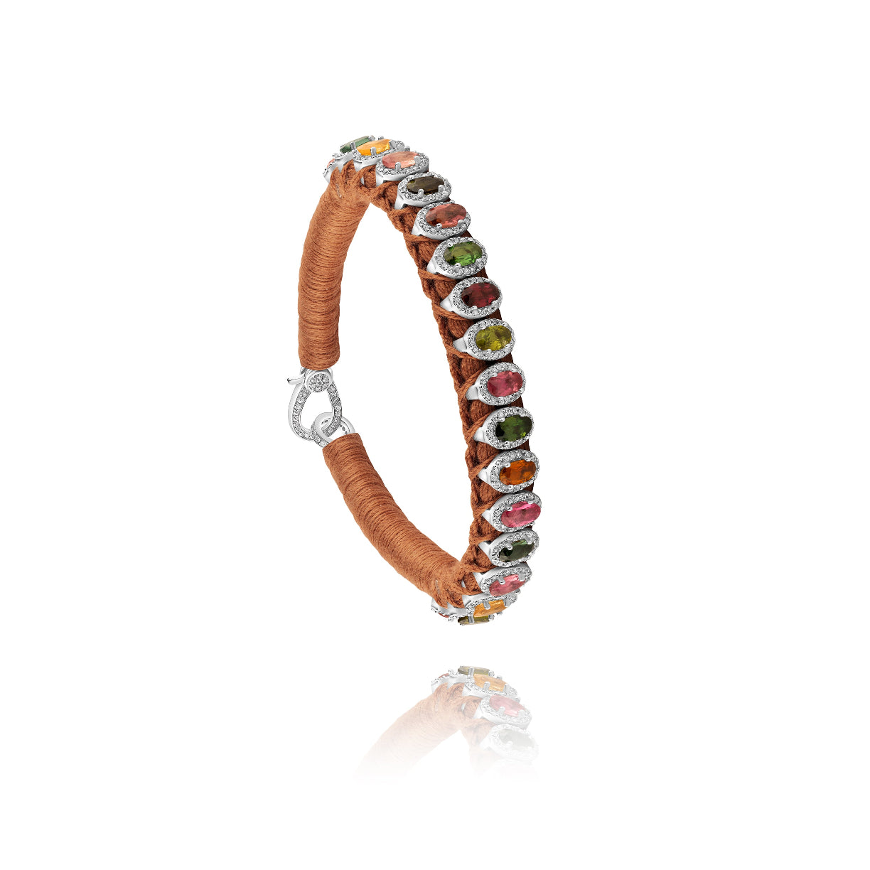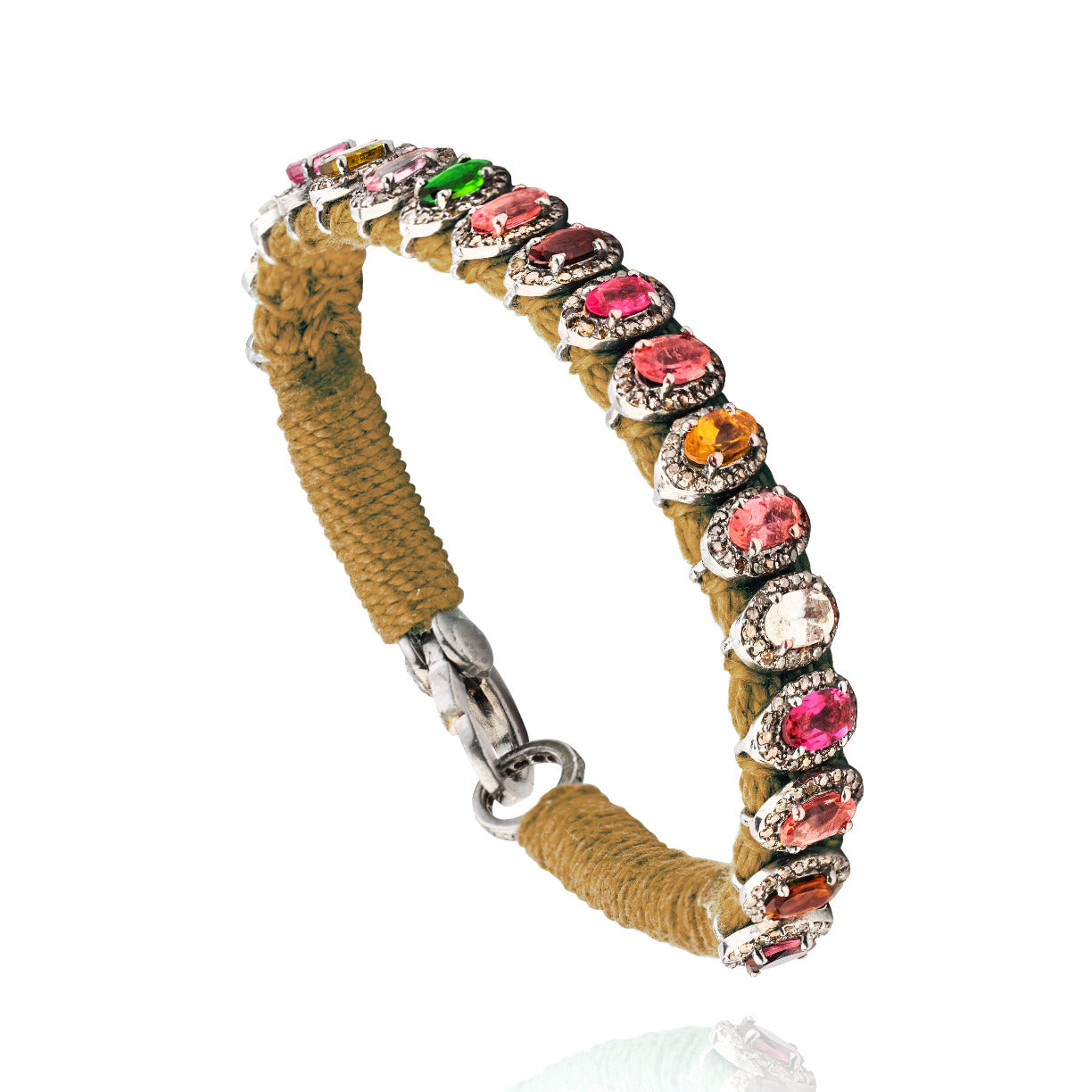 Bracelet fin en fil de coton tressé de couleur camel. Il est orné de multiples petits ovales en argent intégralement sertis de plus de 200 diamants et rehaussés, en leur centre, de Tourmalines multicolores.