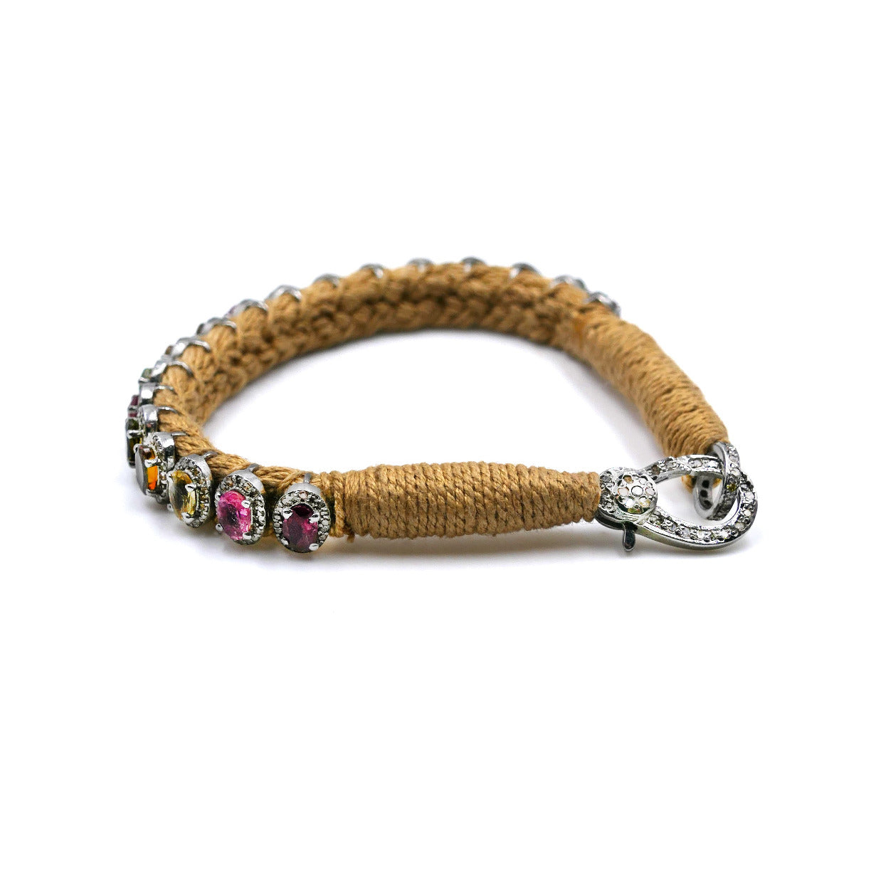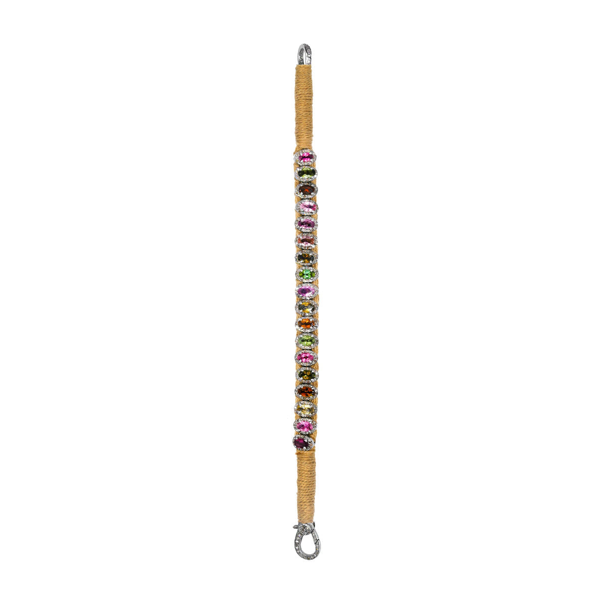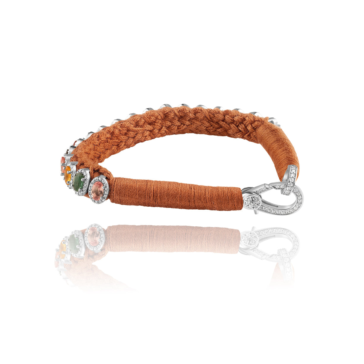 Bracelet fin en fil de coton tressé de couleur camel. Il est orné de multiples petits ovales en argent intégralement sertis de plus de 200 diamants et rehaussés, en leur centre, de Tourmalines multicolores.