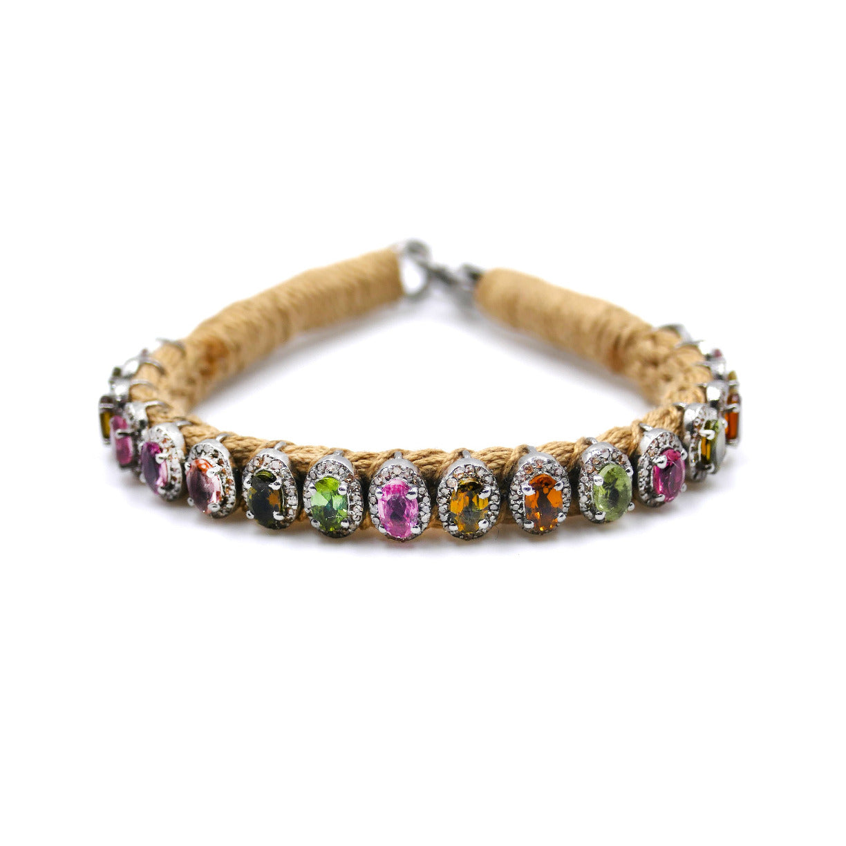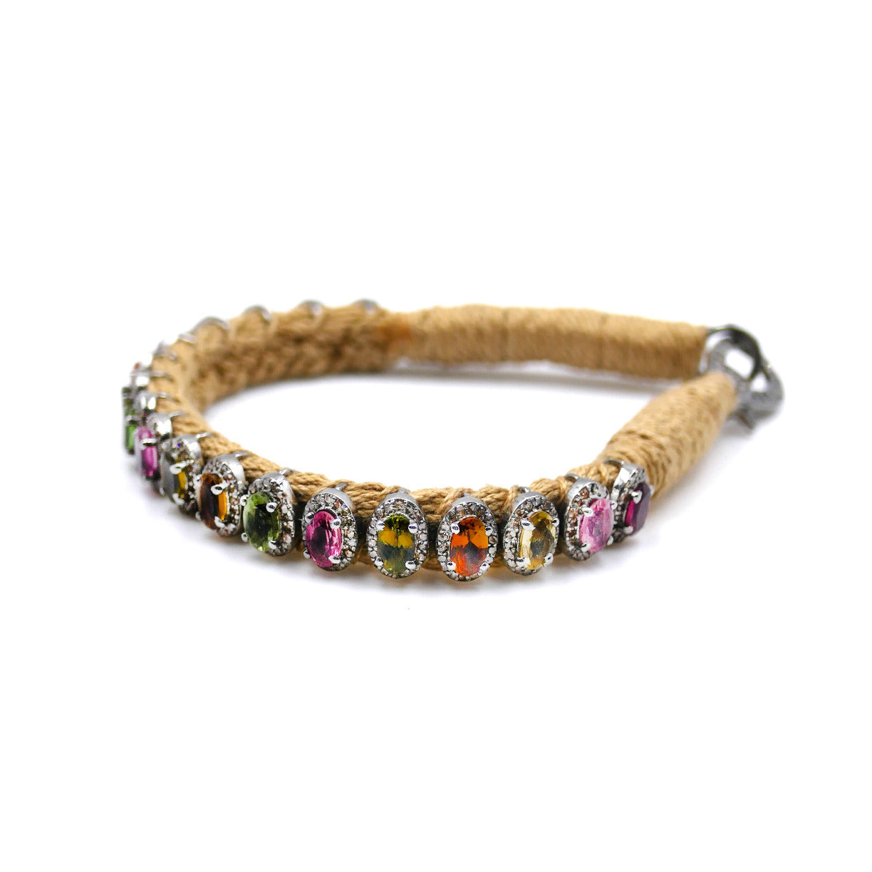 Bracelet en fil de coton tressé de couleur camel, décoré d’un motif en argent 925 et serti d’une multitude de diamants. Il est également décoré de splendides Tourmalines multicolores.