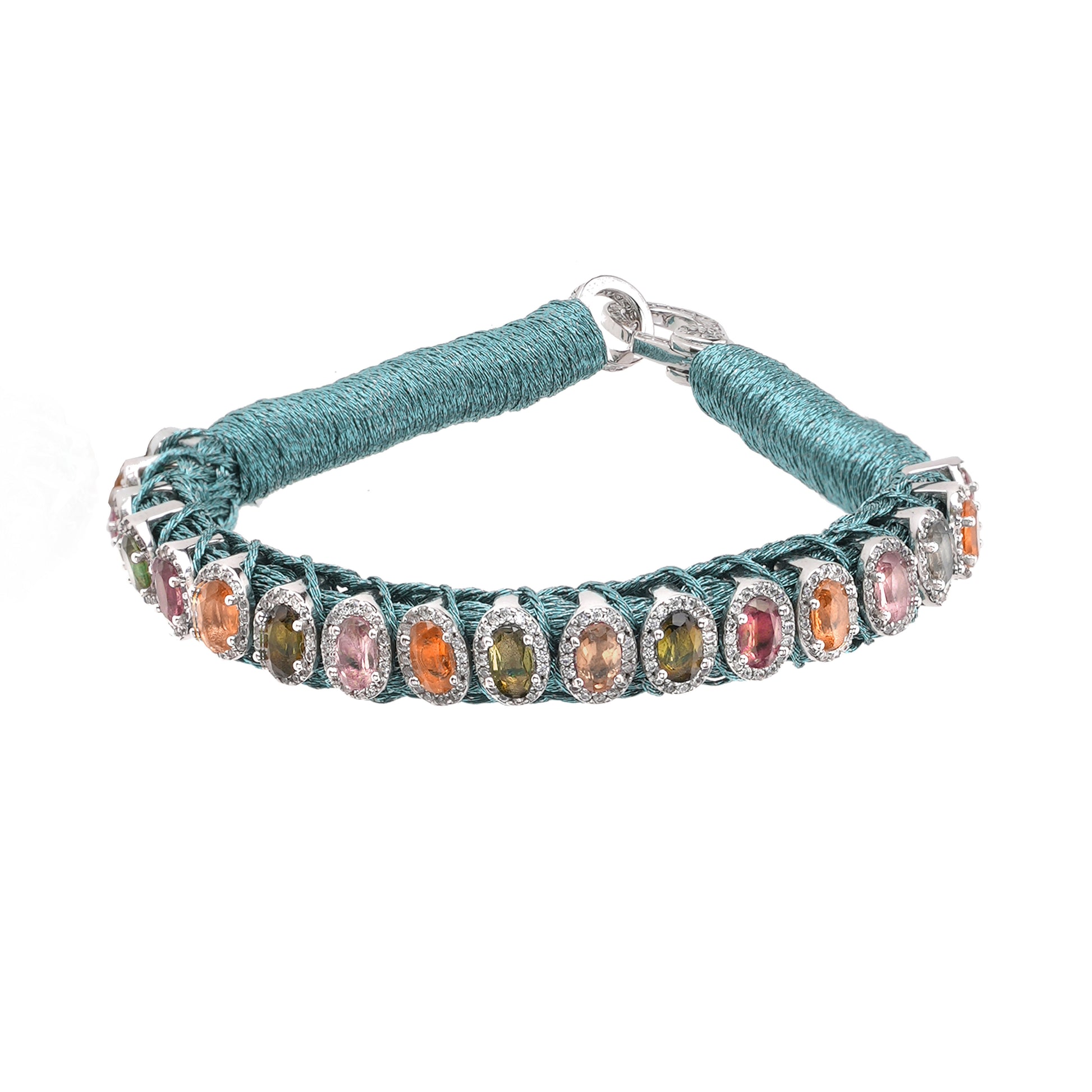 Bracelet en fil de lurex tressé de couleur sky décoré d’un motif en argent 925 et serti d’une multitude de diamants. Il est également décoré de splendides Tourmalines multicolores.