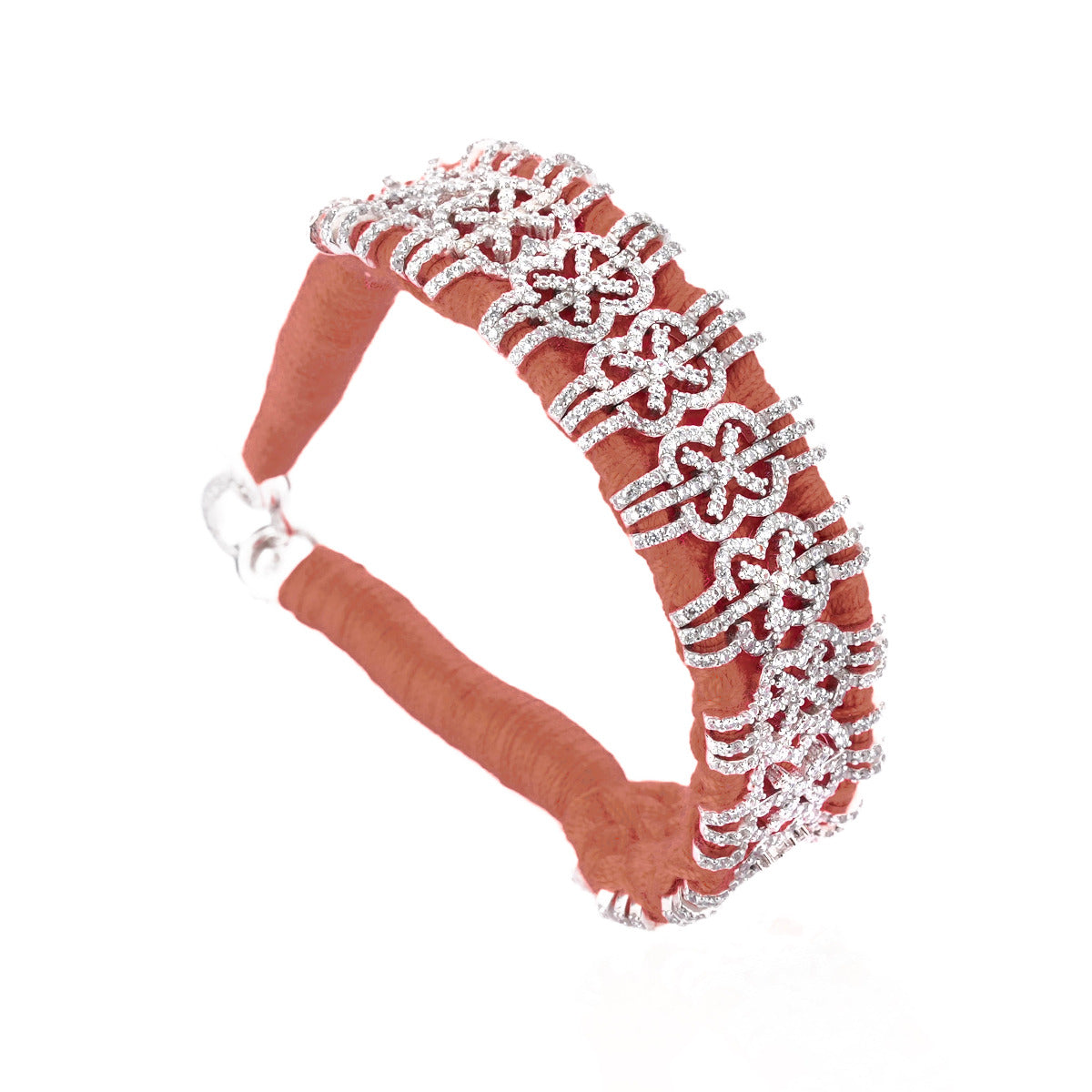 Bracelet en fil de coton tressé de couleur blush, décoré d’un motif en argent 925 et serti d’une multitude de diamants.