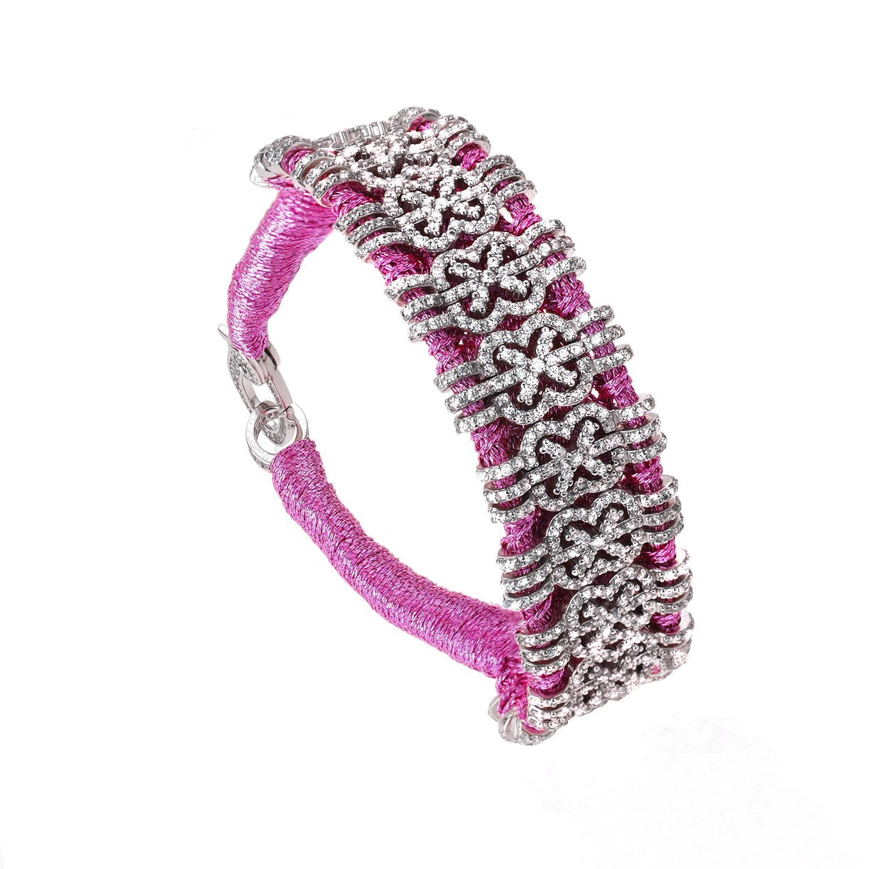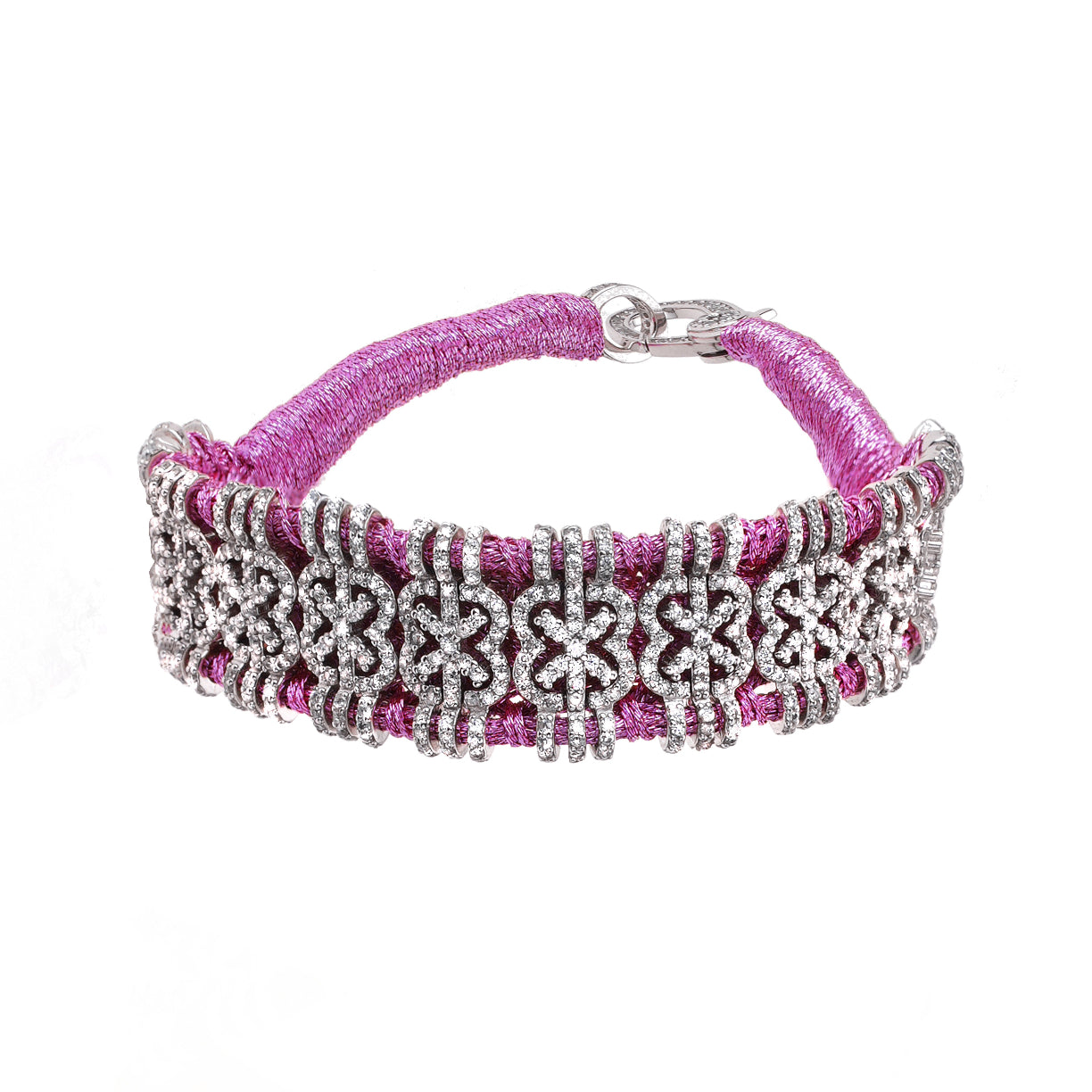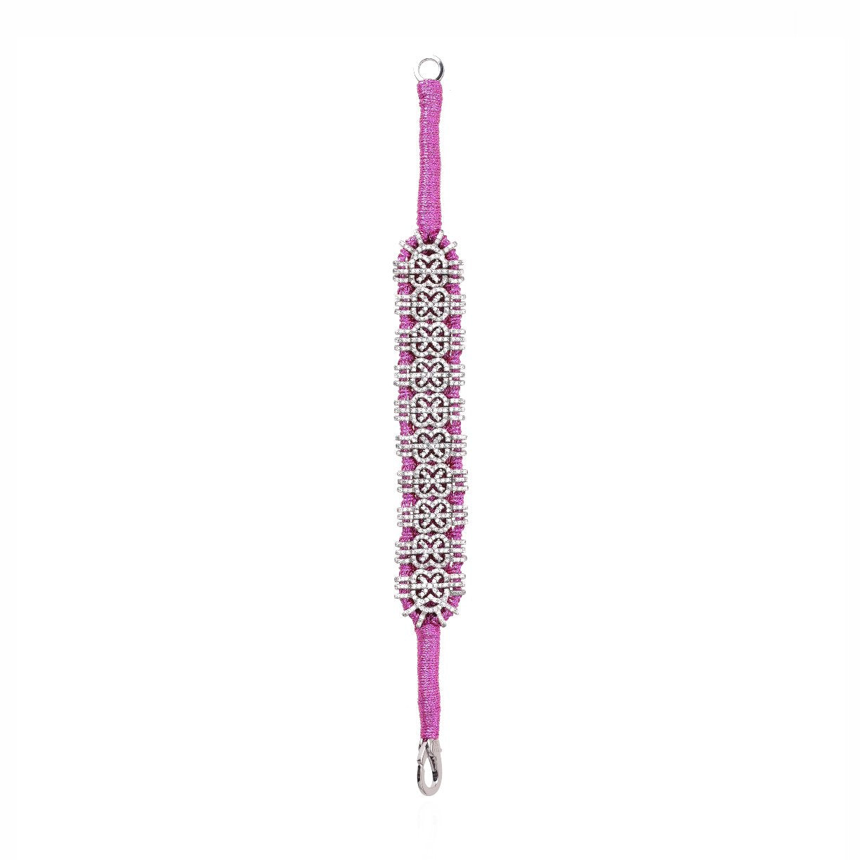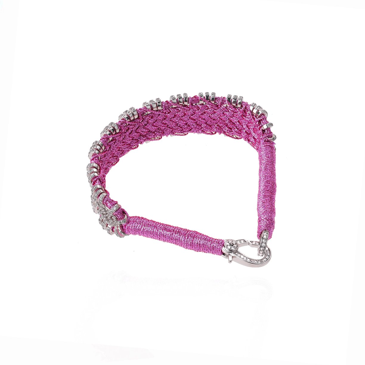 Bracelet en fil de lurex tressé de couleur candy, décoré d’un motif en argent 925 et serti d’une multitude de diamants.