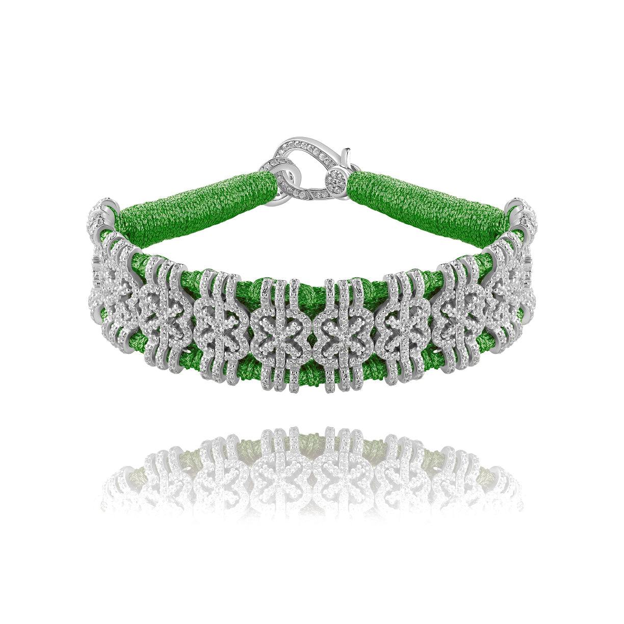 Bracelet en fil de lurex tressé de couleur vert grass, décoré d’un motif en argent 925 et serti d’une multitude de diamants.