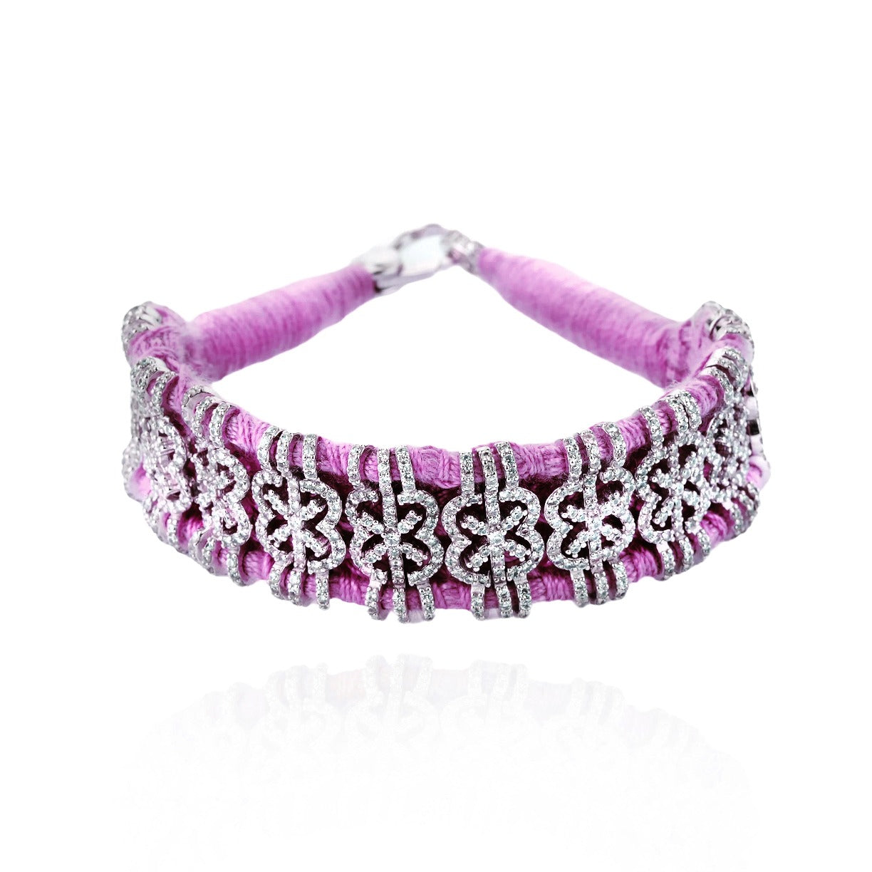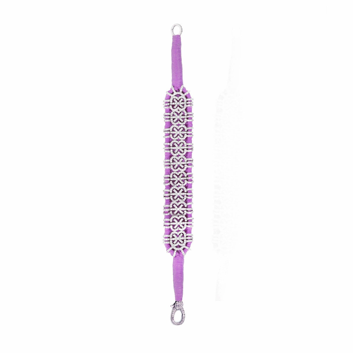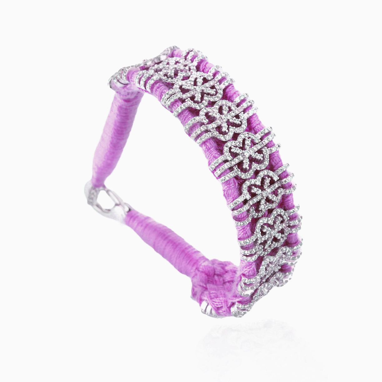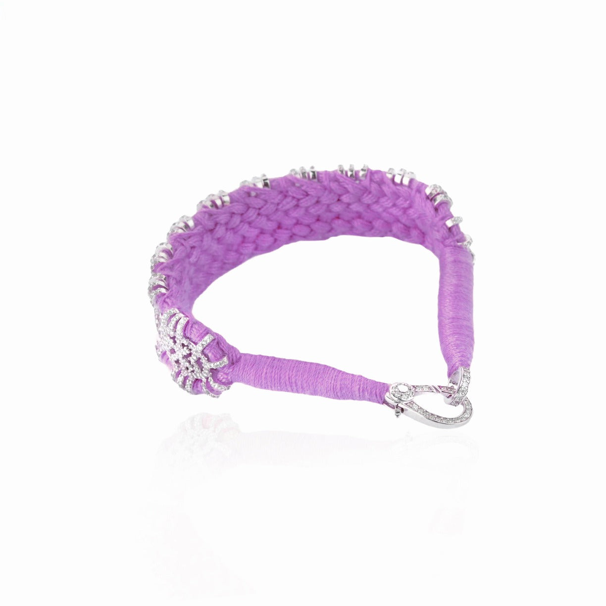 Bracelet en fil de coton tressé de couleur lilas, décoré d’un motif en argent 925 et serti d’une multitude de diamants.