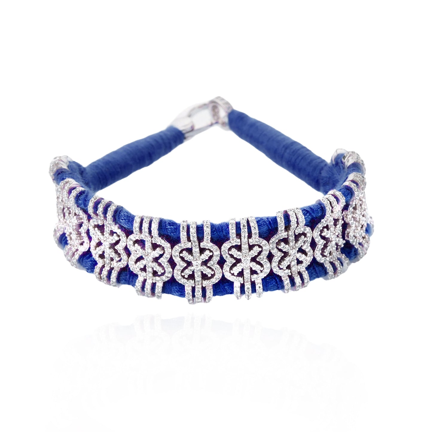 Bracelet en fil de coton tressé de couleur roy, décoré d’un motif en argent 925 et serti d’une multitude de diamants.