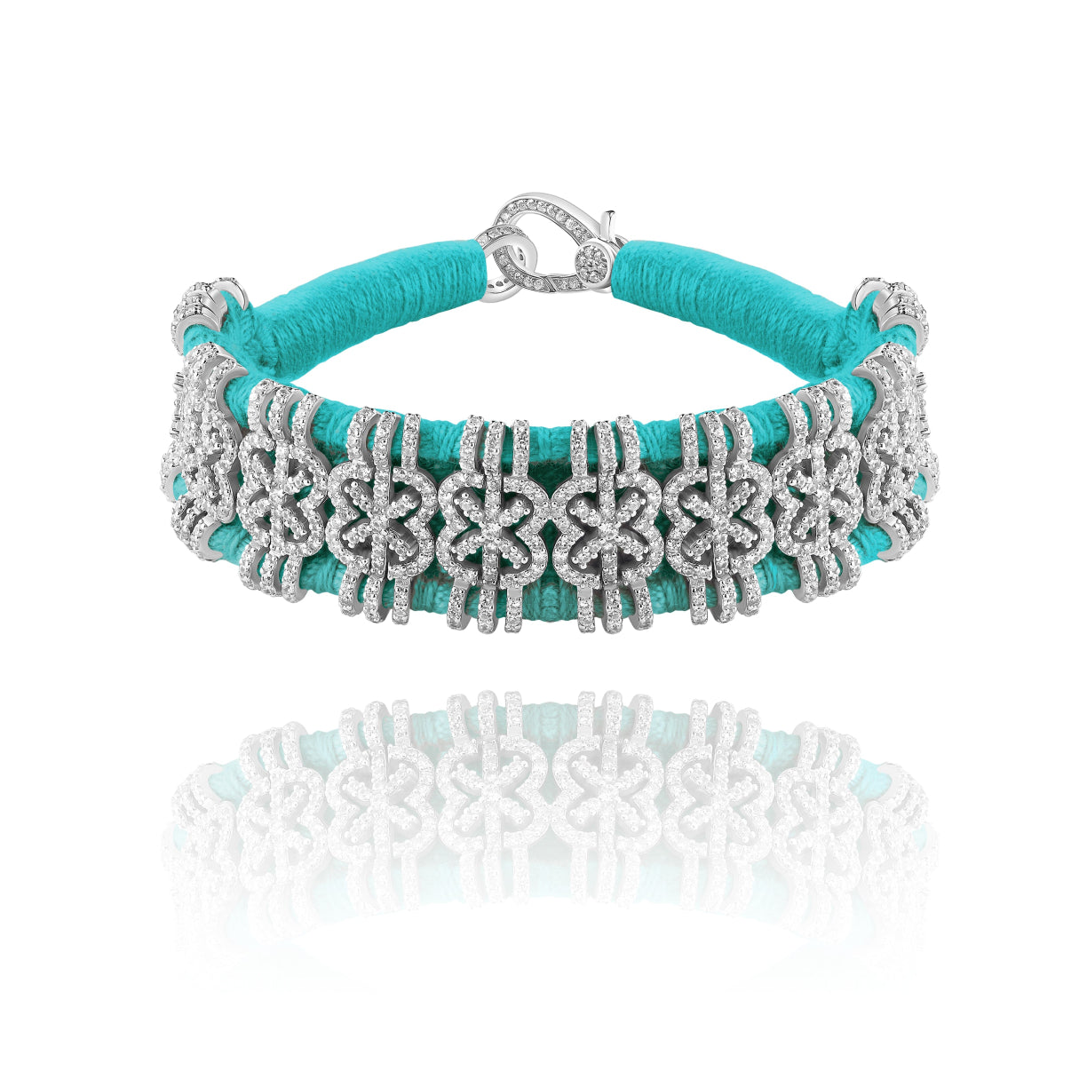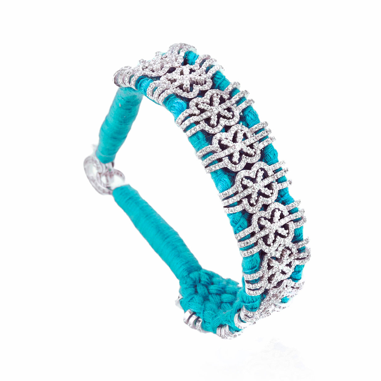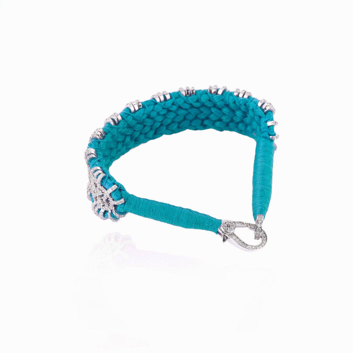 Bracelet en fil de coton tressé de couleur turquoise, décoré d’un motif en argent 925 et serti d’une multitude de diamants.