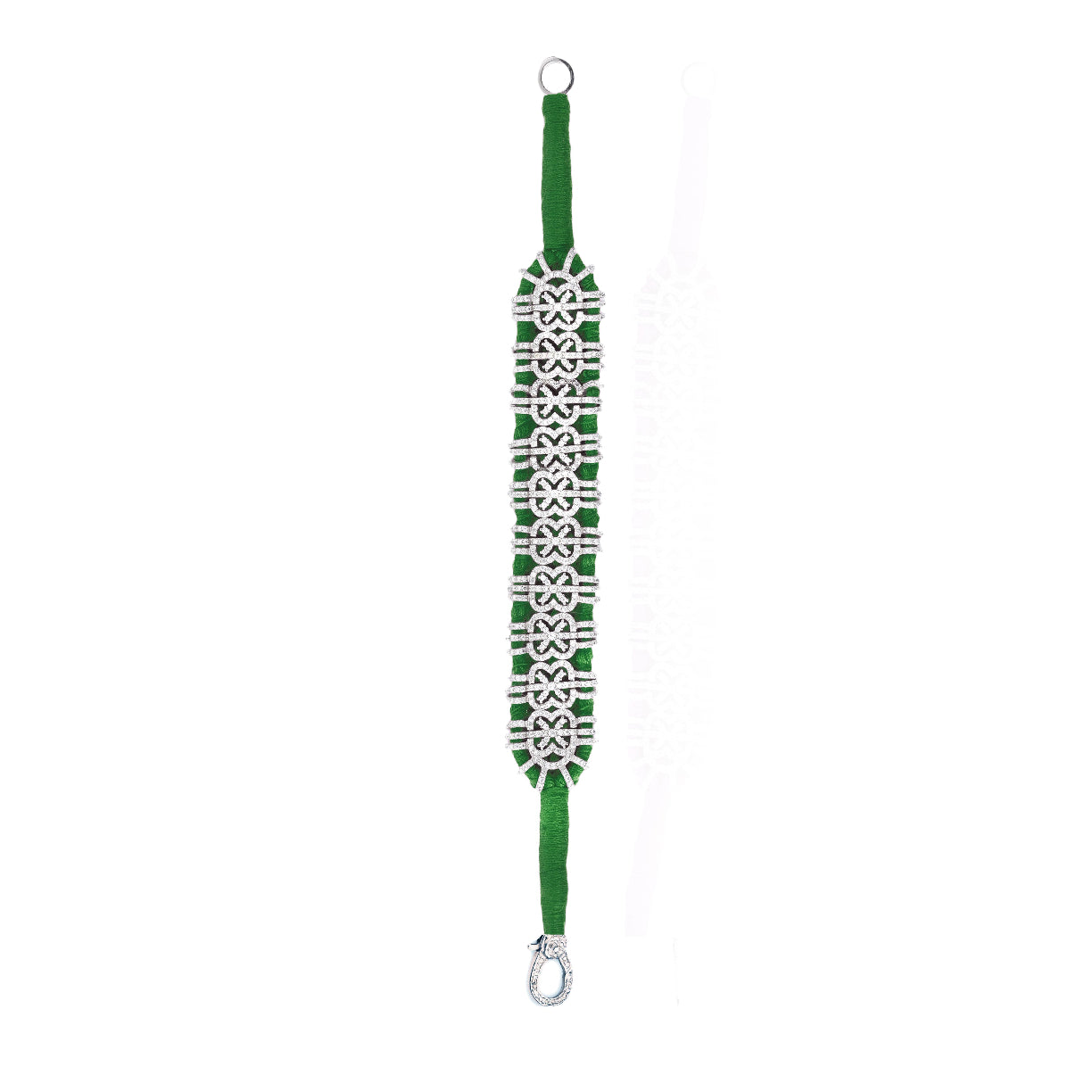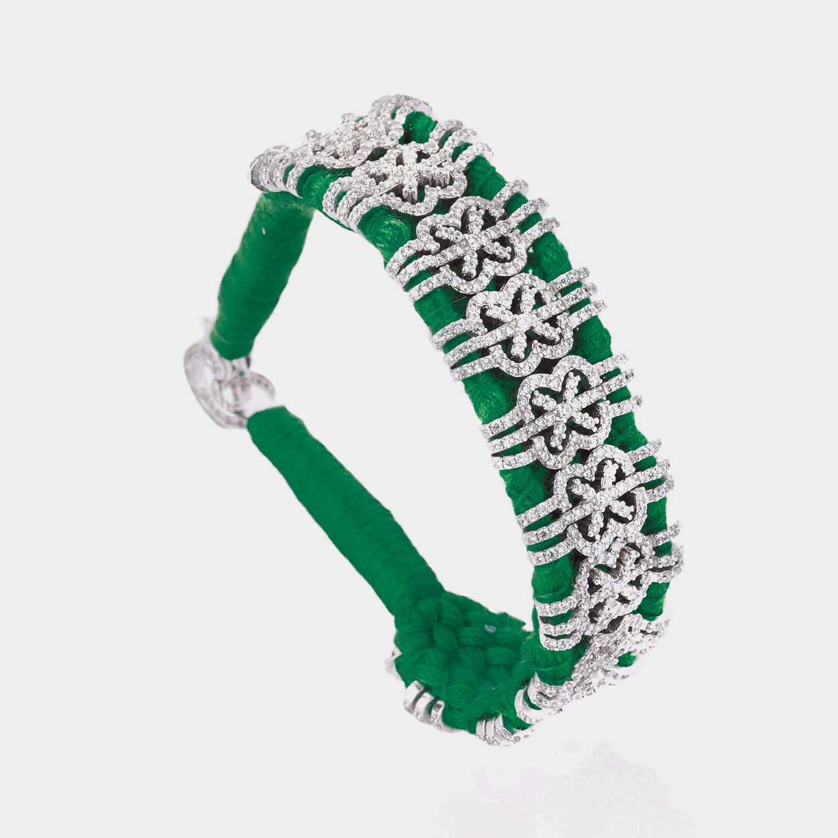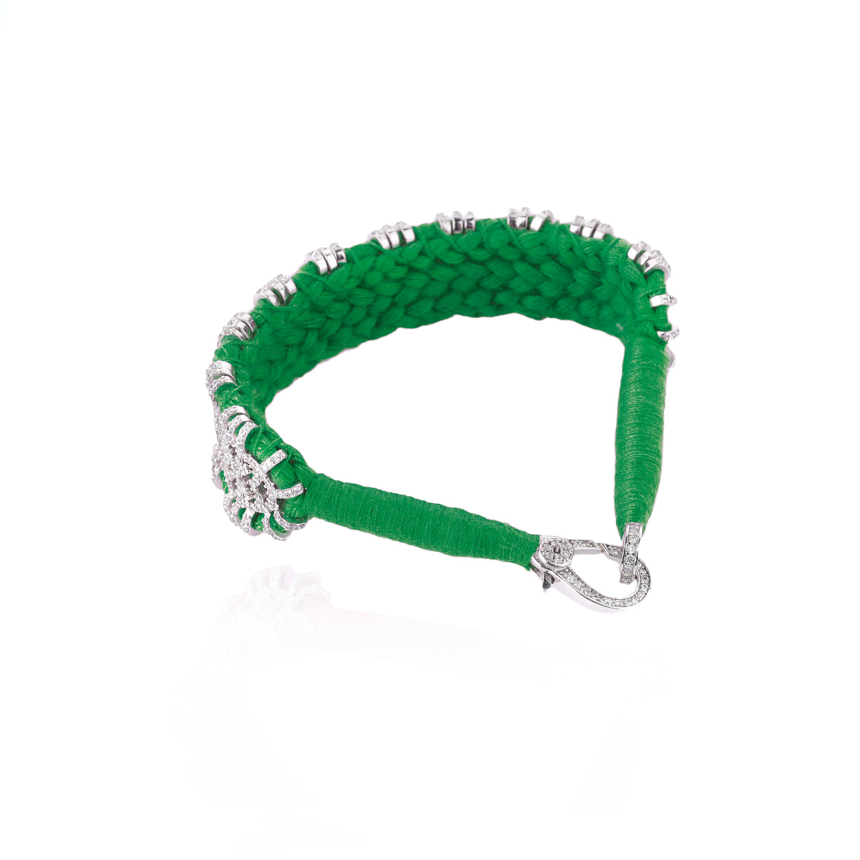 Bracelet en fil de coton tressé de couleur vert, décoré d’un motif en argent 925 et serti d’une multitude de diamants.