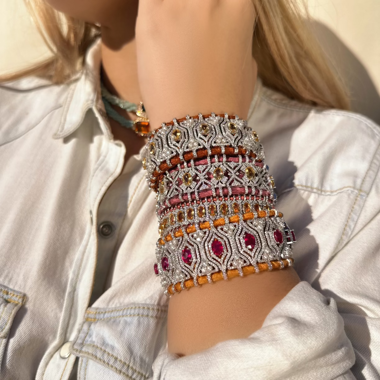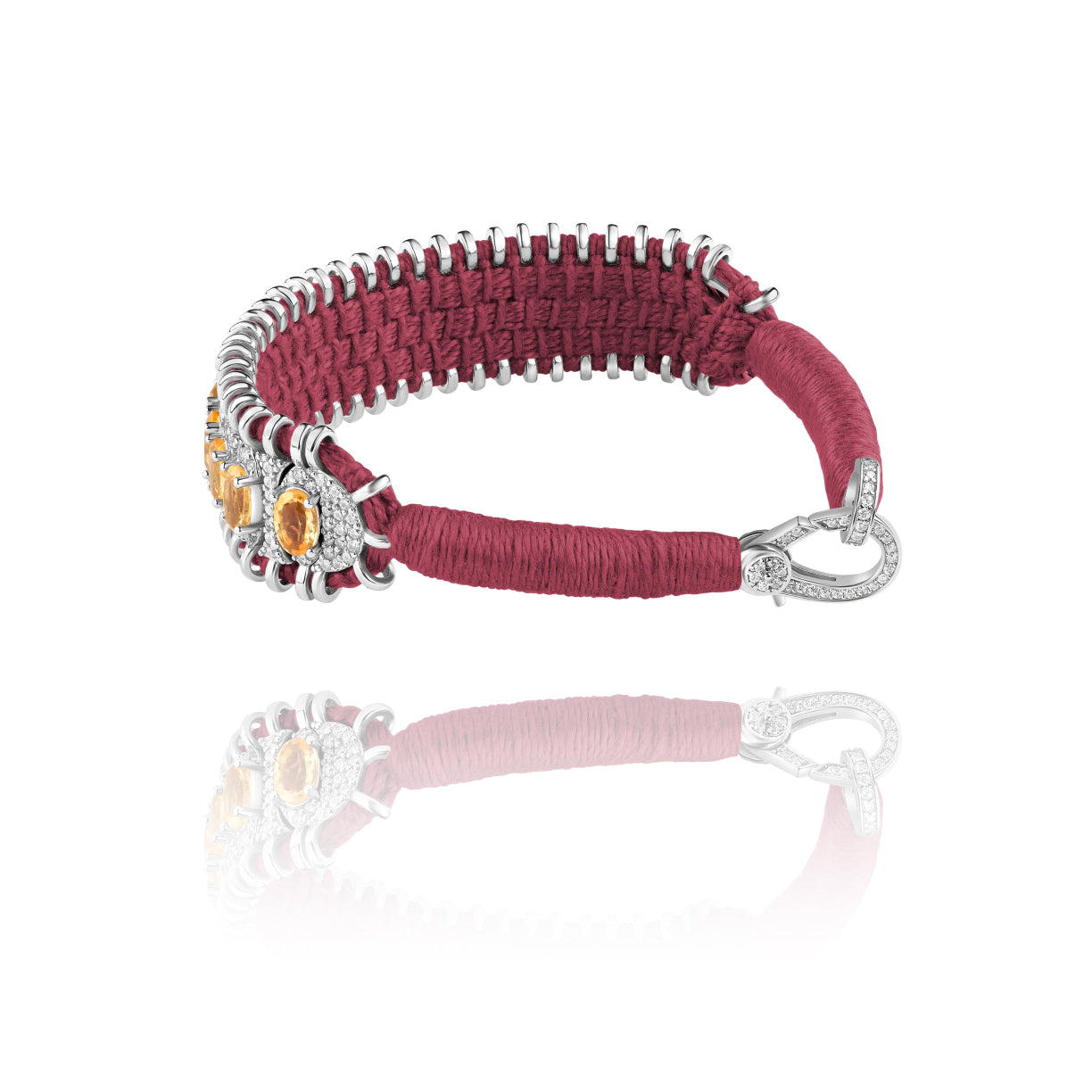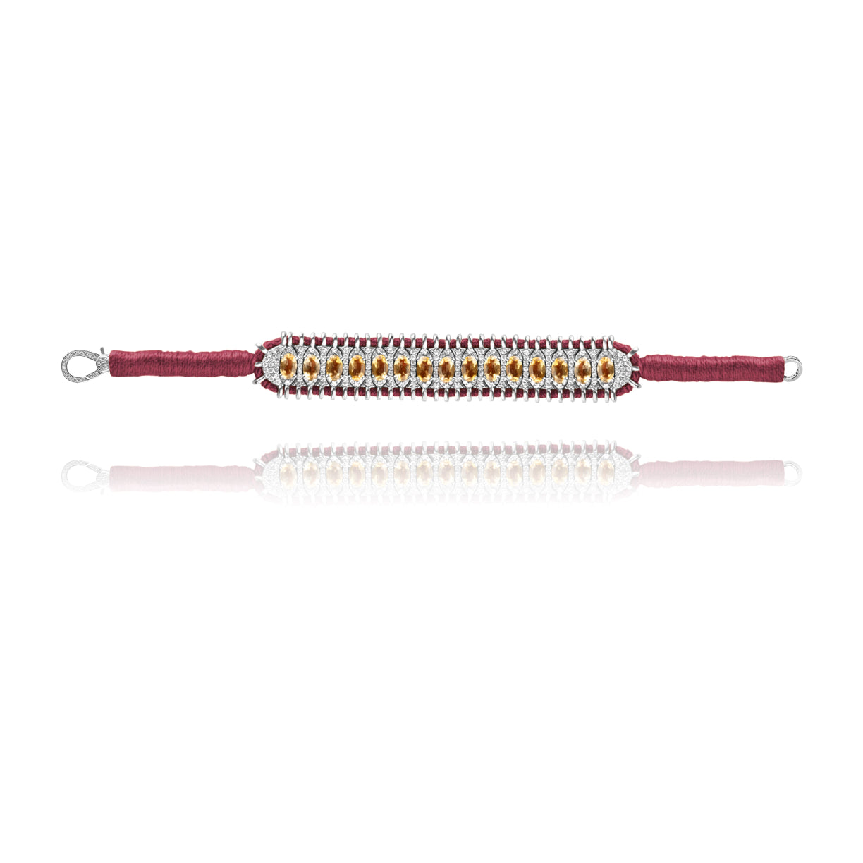 Bracelet en fil de coton tressé bamboo orné d'un motif en argent 925 entièrement pavé de diamants et rehaussé de citrines.
