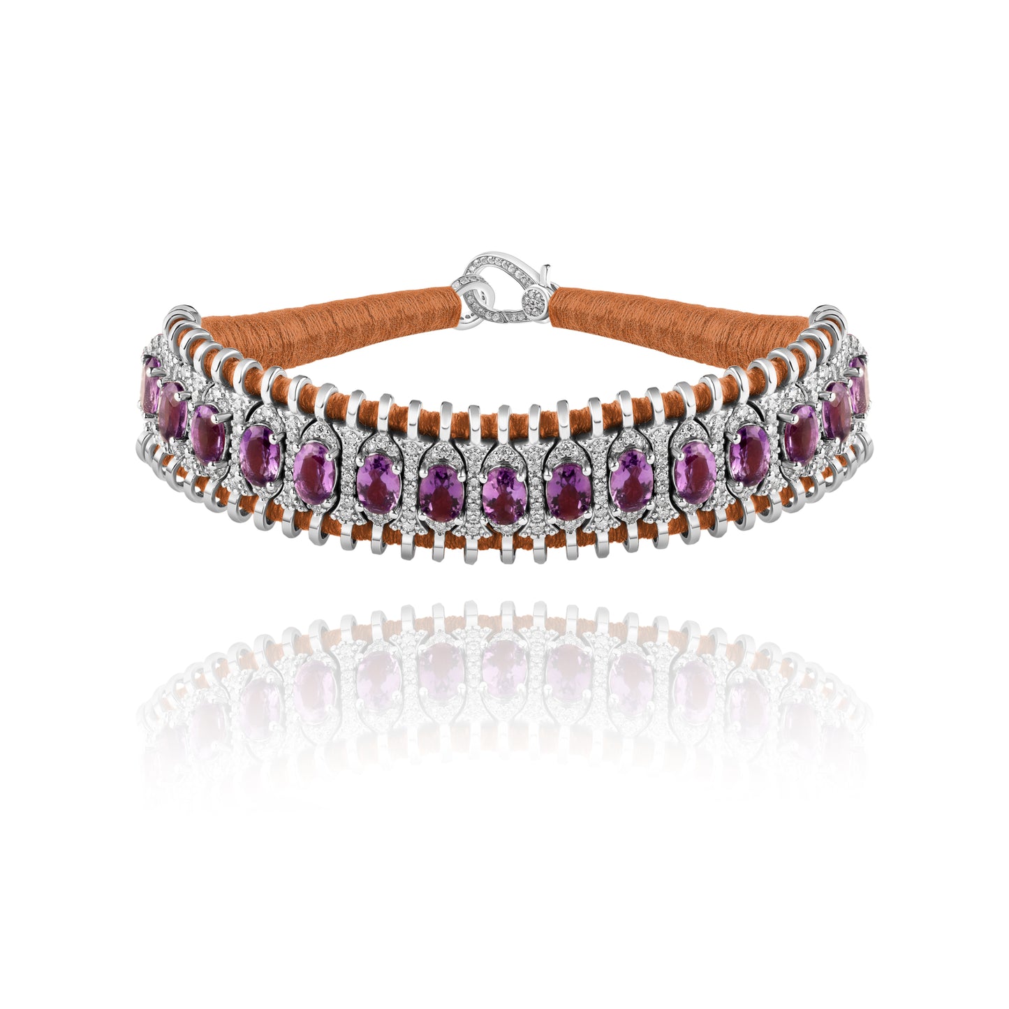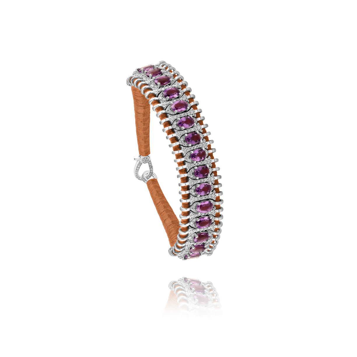 Bracelet en fil de coton tressé camel orné d'un motif en argent 925 entièrement pavé de diamants et rehaussé d'améthystes.