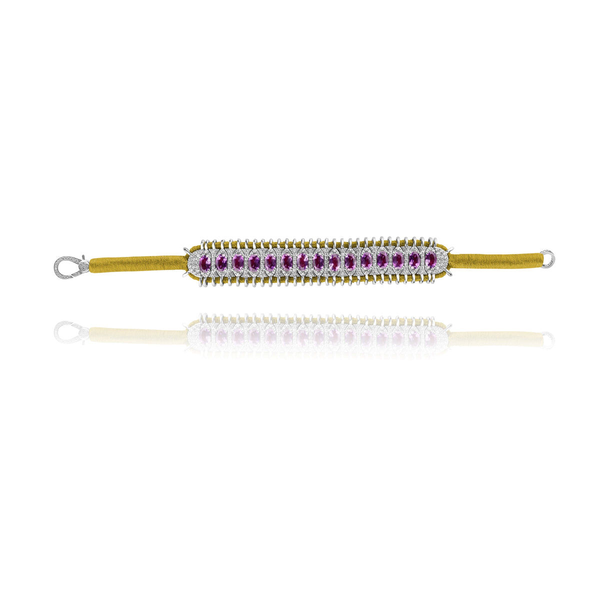Bracelet en fil de coton tressé mordoré orné d'un motif en argent 925 entièrement pavé de diamants et rehaussé d'améthystes.
