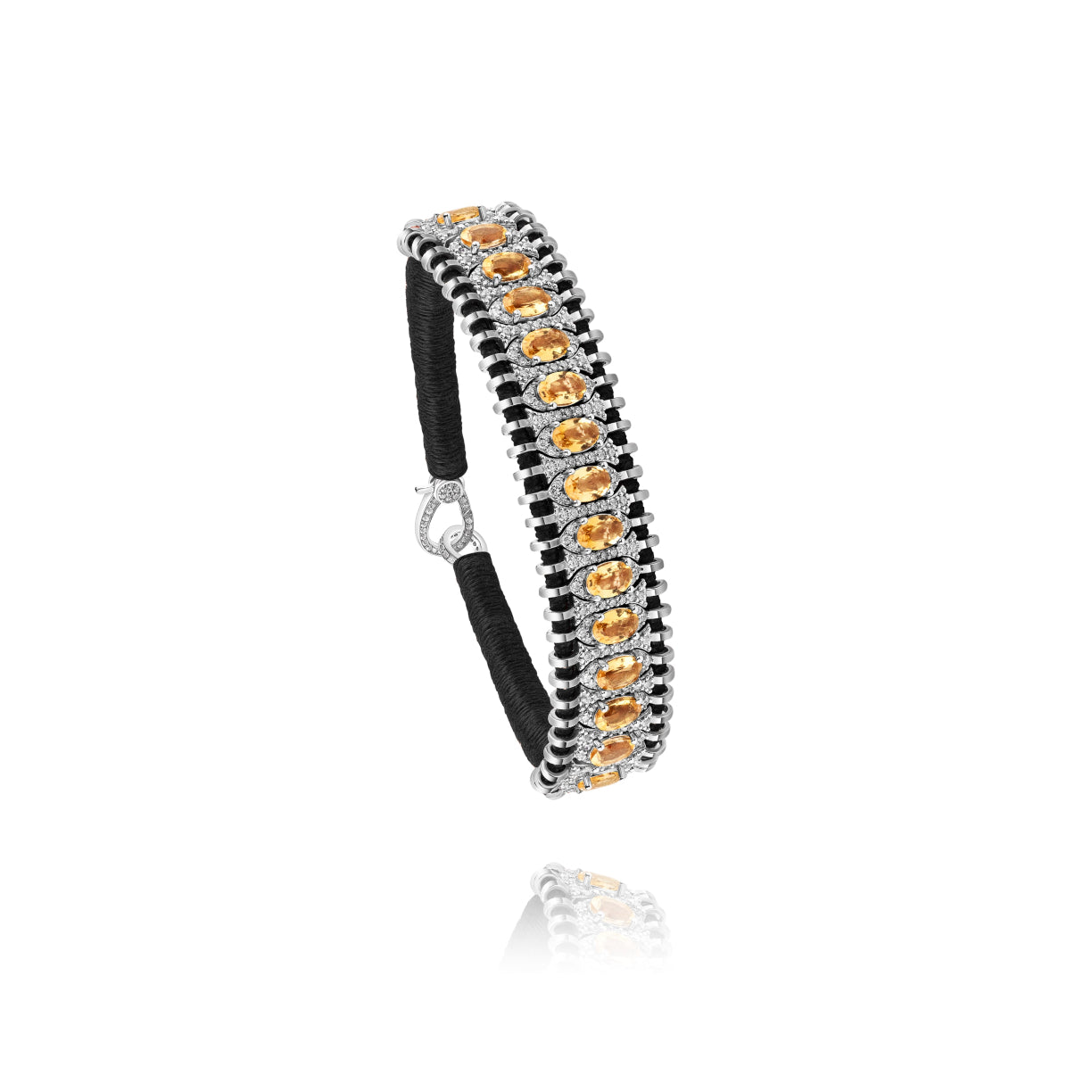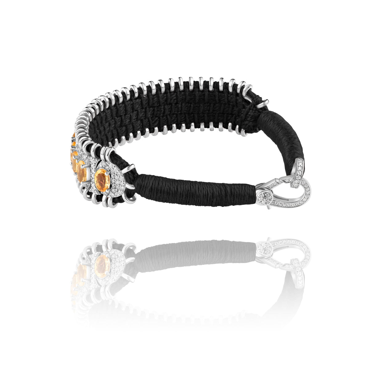 Bracelet en fil de coton tressé noir orné d'un motif en argent 925 entièrement pavé de diamants et rehaussé de citrines.