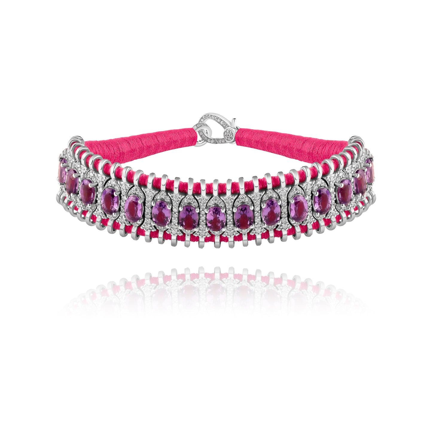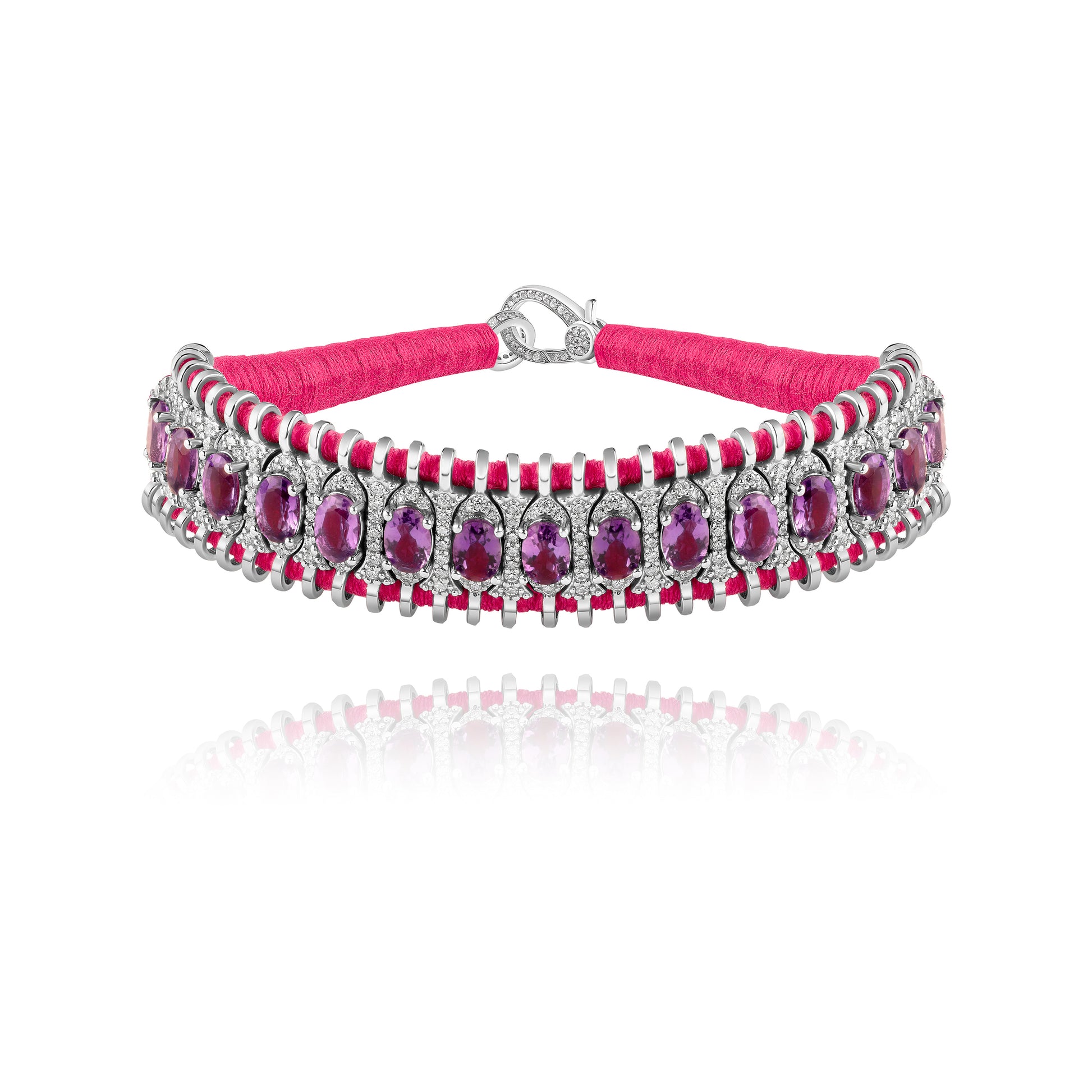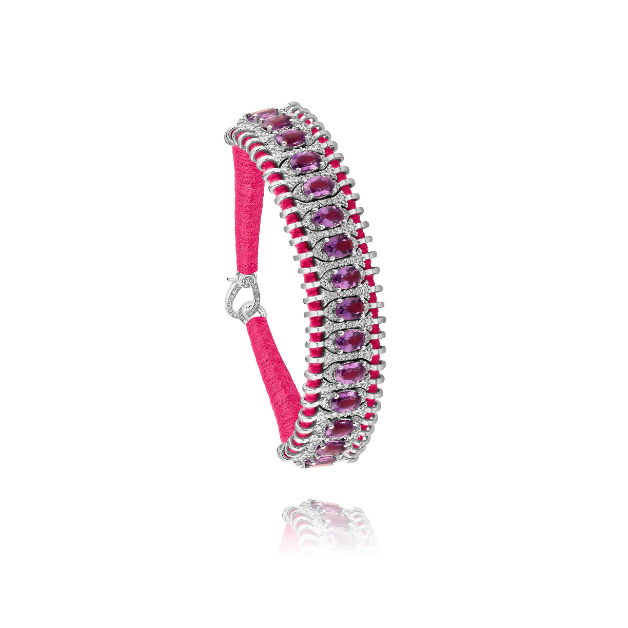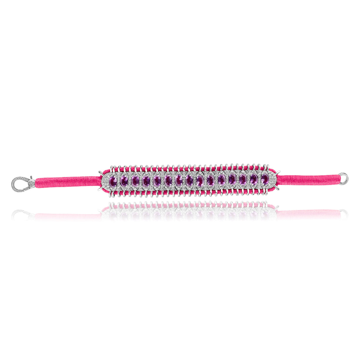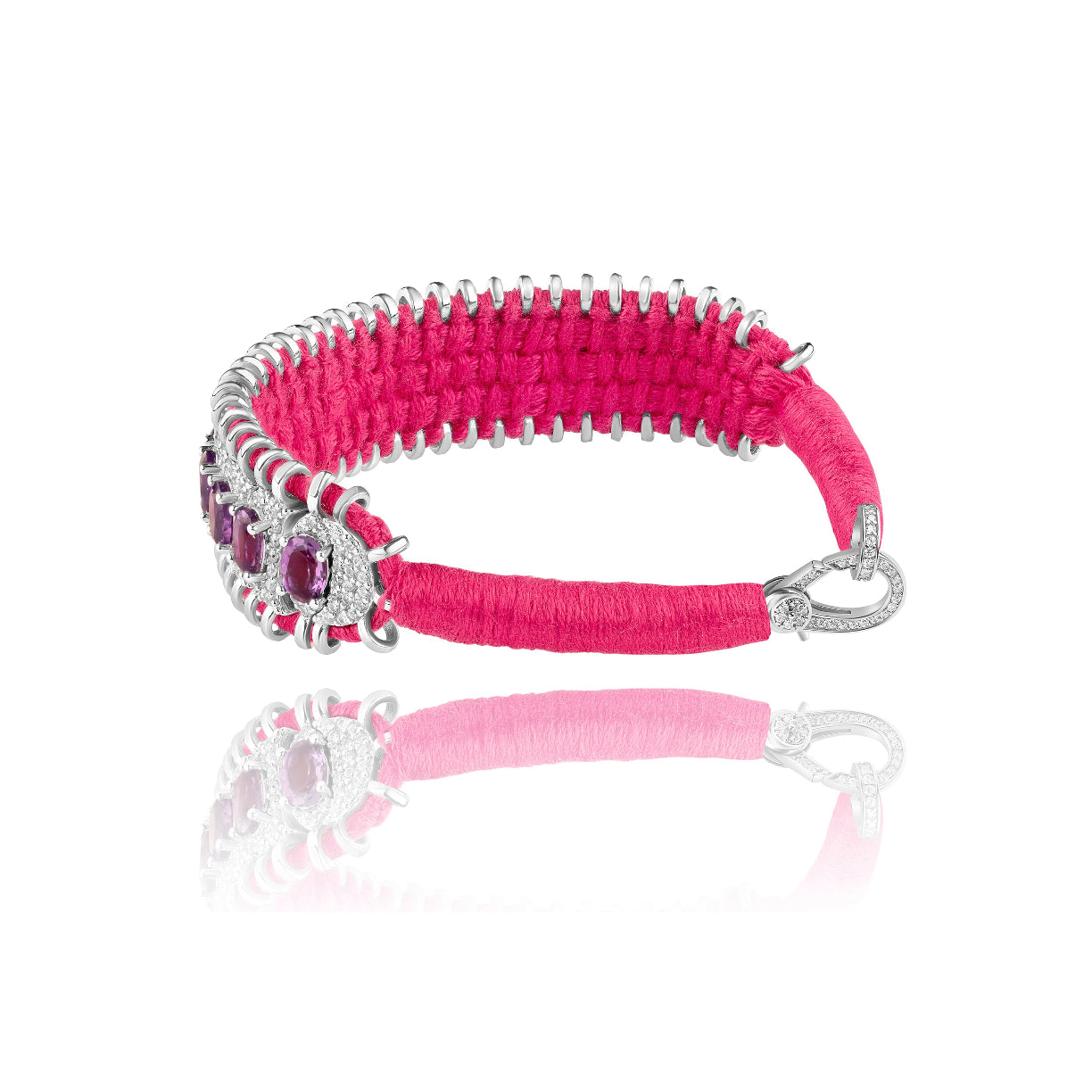 Bracelet en fil de coton tressé rani orné d'un motif en argent 925 entièrement pavé de diamants et rehaussé d'améthystes.