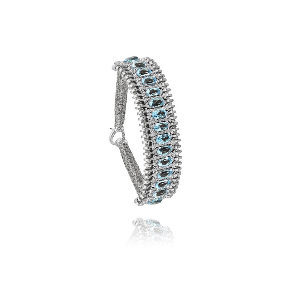 Bracelet en fil de lurex tressé silver orné d'un motif en argent 925 entièrement pavé de diamants et rehaussé de topaze.