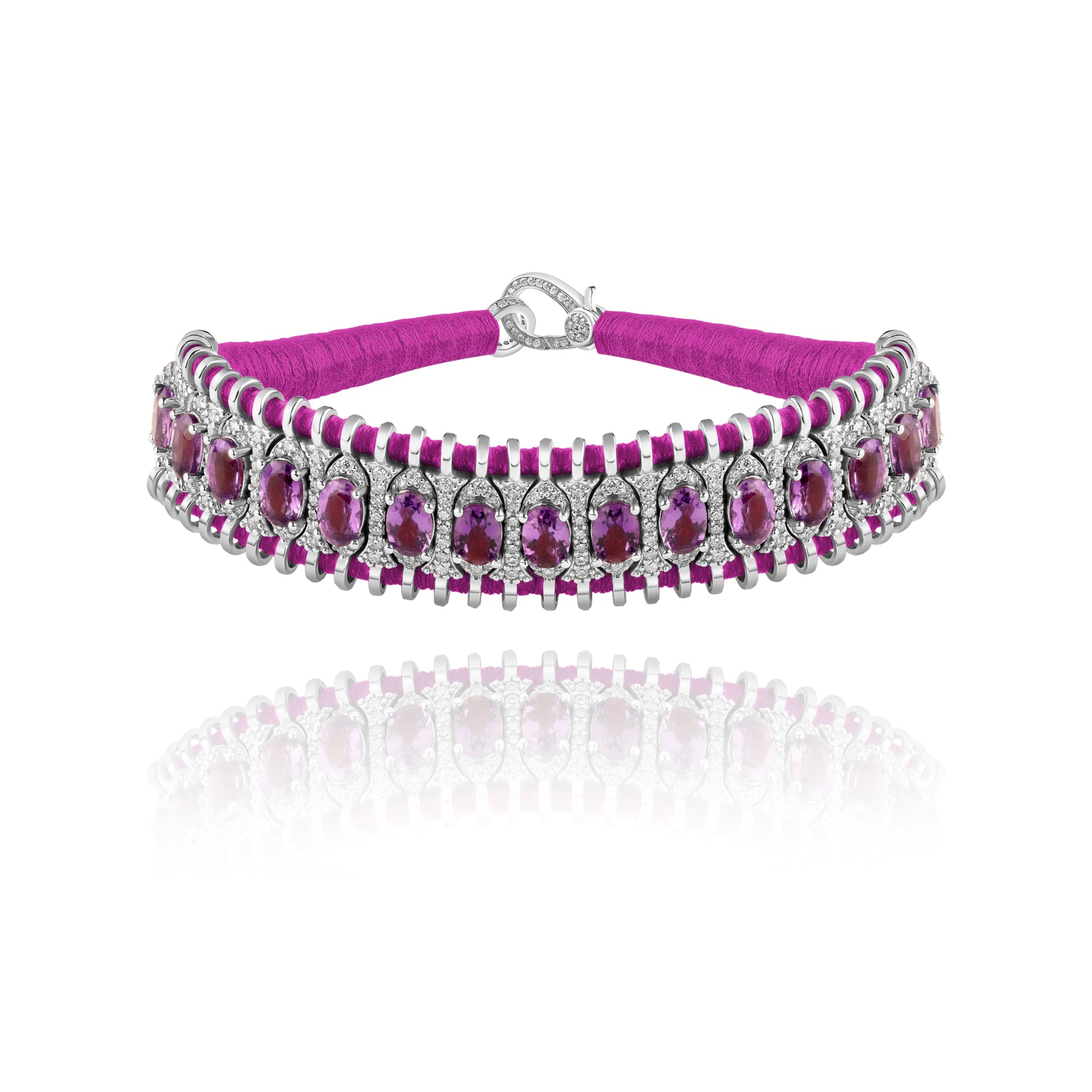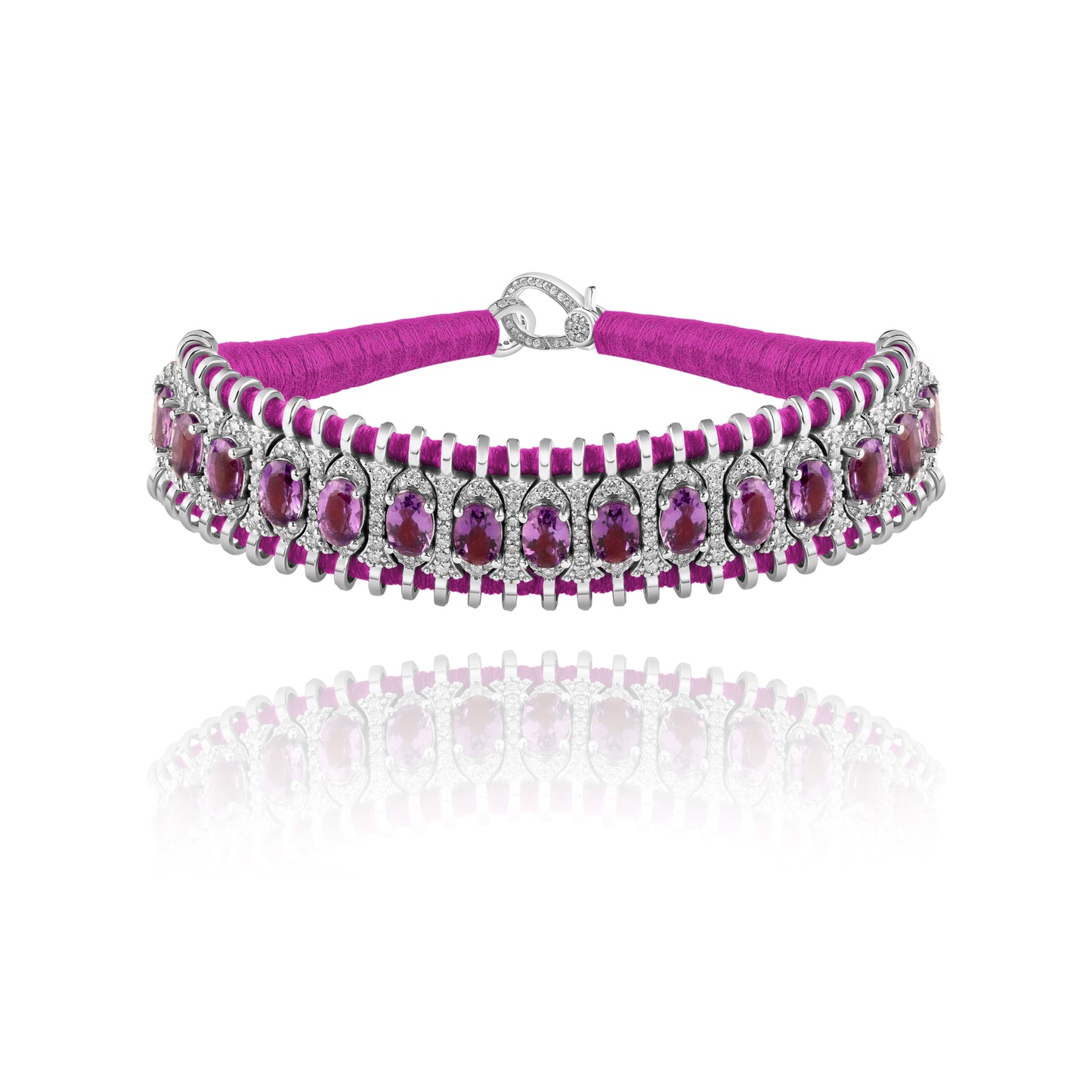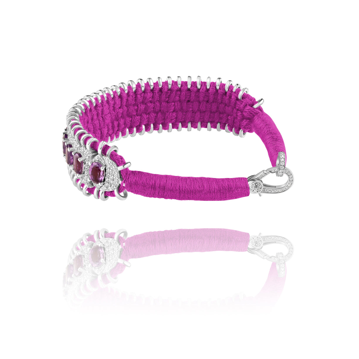 Bracelet en fil de coton tressé violet orné d'un motif en argent 925 entièrement pavé de diamants et rehaussé d'améthystes.