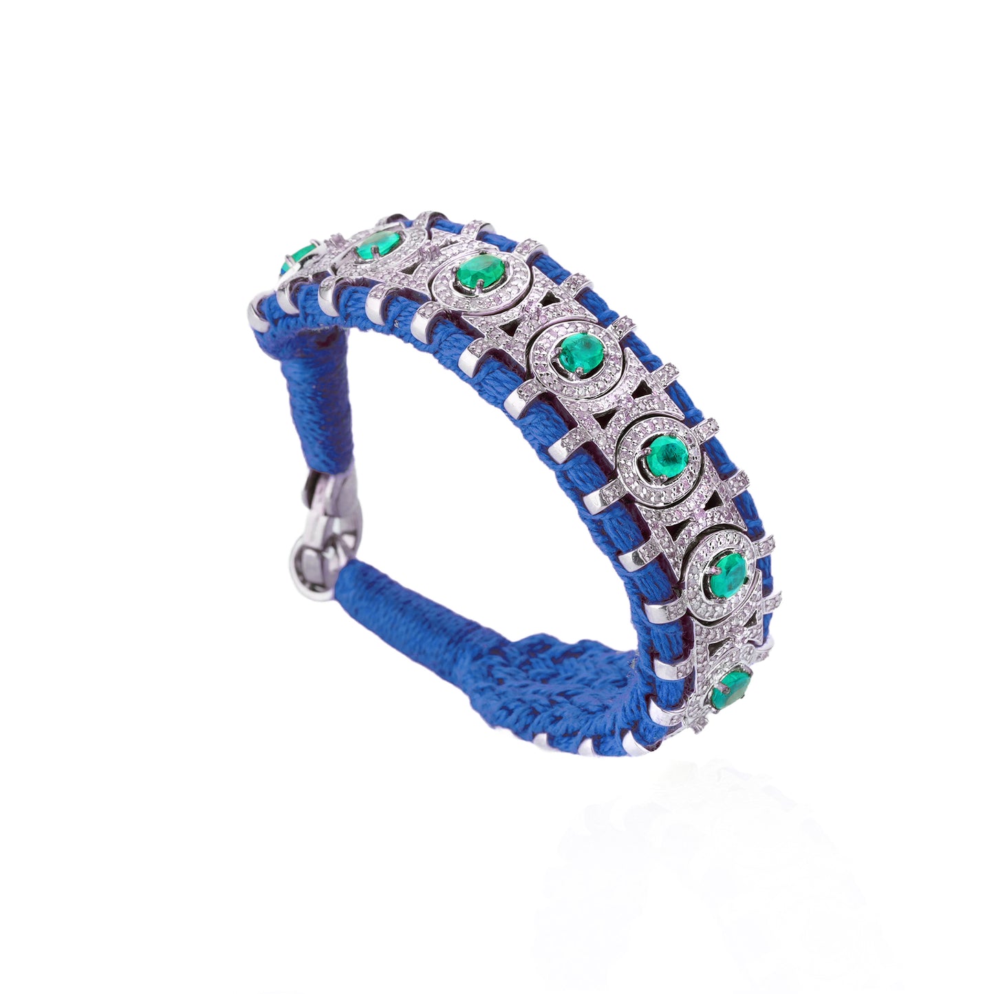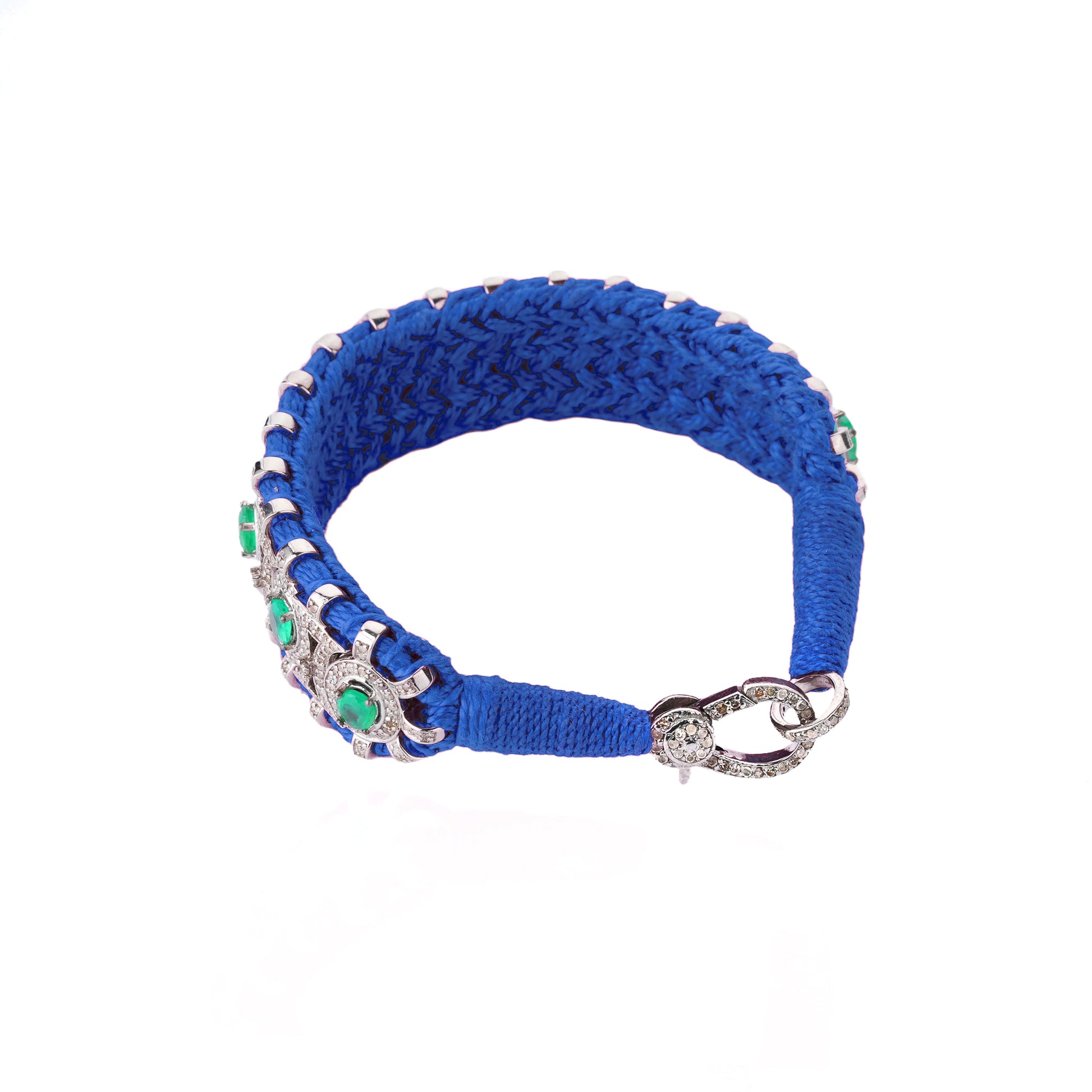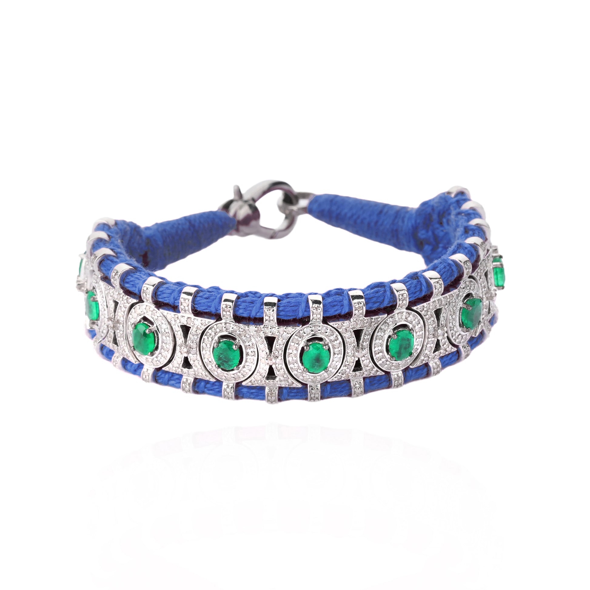 Bracelet en fil de coton tressé de couleur roy, décoré d’un motif en argent 925 et serti d’une multitude de diamants. Il est décoré de splendides émeraudes véritables.