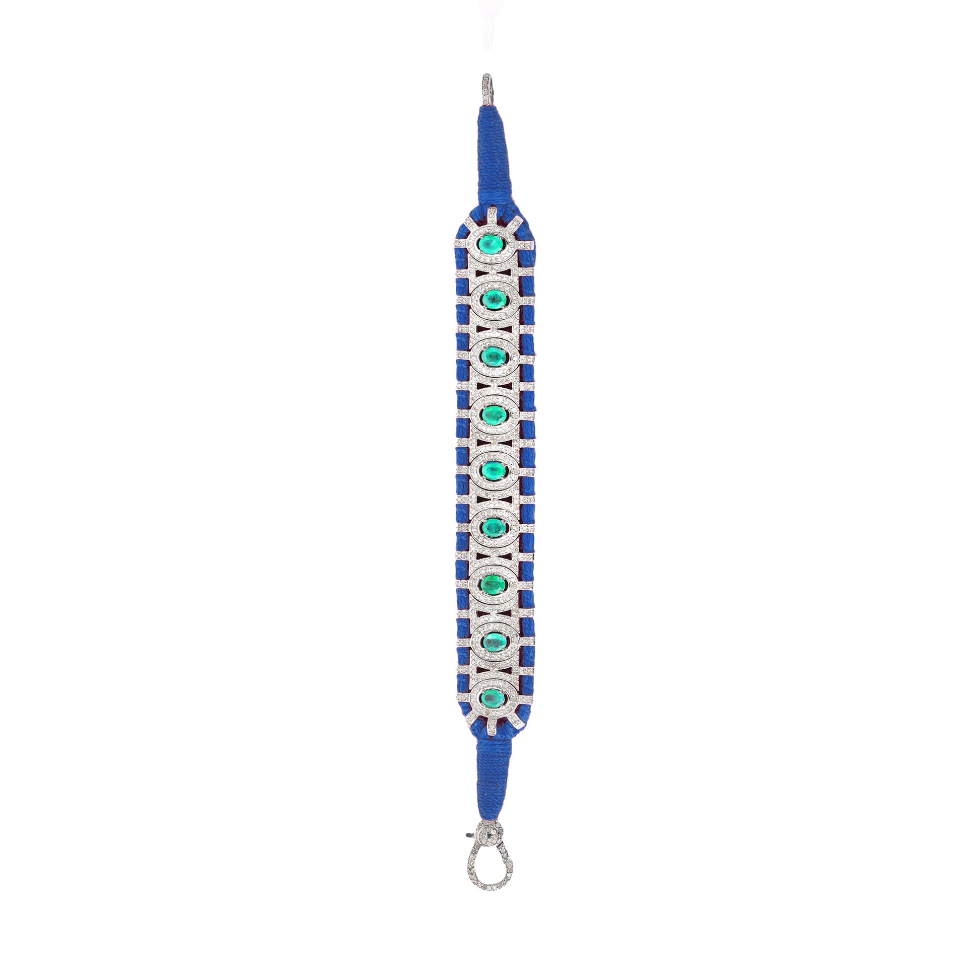 Ce bracelet en fil couleur bleu roi sera votre porte-bonheur bohème de l’été. Il est intégralement décoré d’argent formant un motif ovale serti de plus de 300 diamants. Chaque petit ovale est magnifiquement décoré d’une émeraude centrale. Il sera pour toujours, votre friendship bracelet au style précieux et ne quittera plus votre poignet.